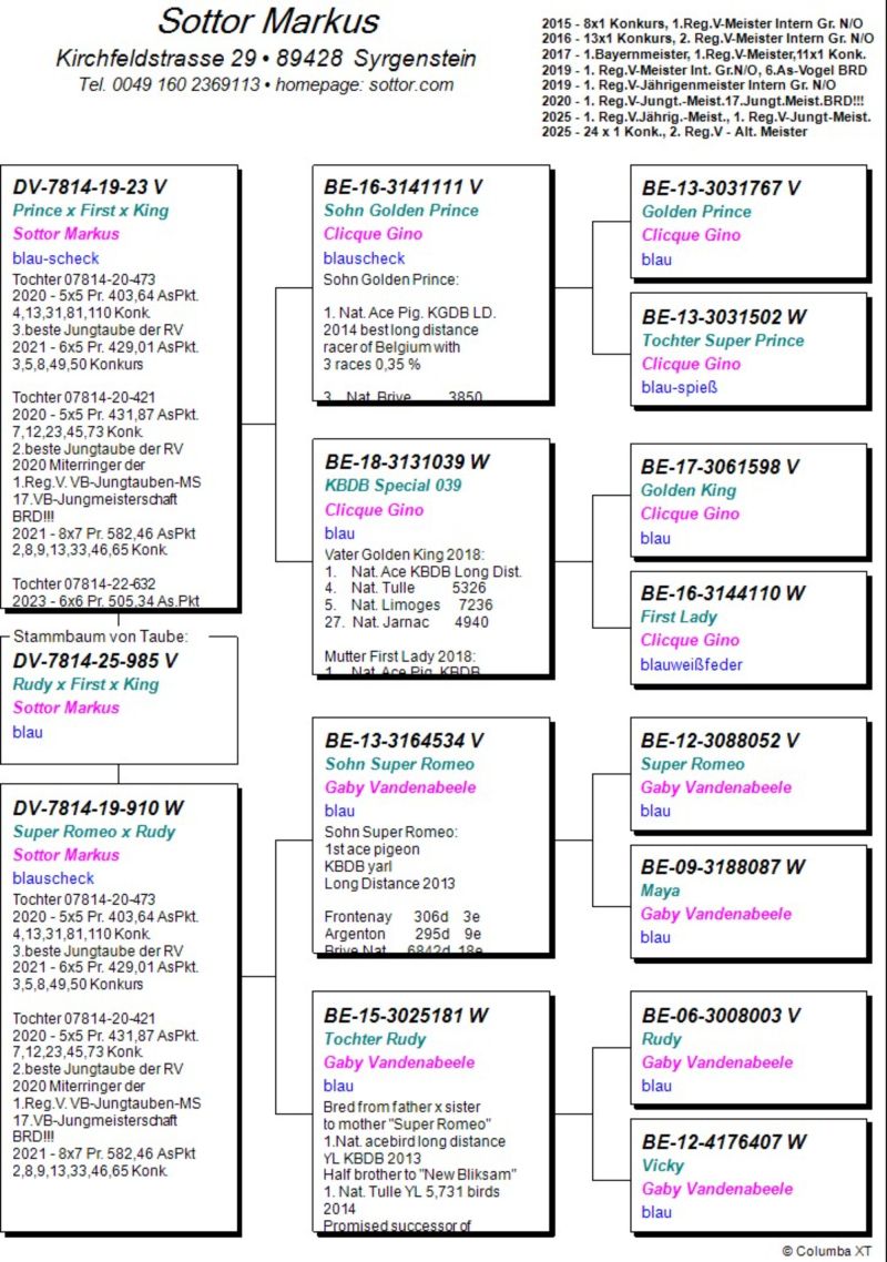 Oryg. gołąb z hodowli Markusa Sottor. Zapewniamy transport gołębi. Gołębie również będzie można odebrać w Katowicach w dniach 07-11.01.2026 r. po wcześniejszej wpłacie na konto. Gołębie znajdują się w Polsce. Więcej informacji w rodowodzie lub tel. 667895177.