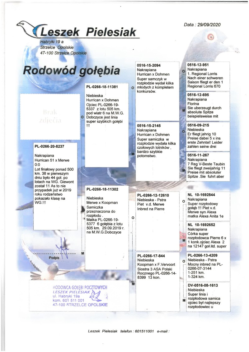 Oryginalny gołąb z hodowli Leszka Pielesiaka. Lotowany na WG gdzie został 11 asem Przed zakupem proszę o kontakt telefoniczny tel. 602185143 Mile widziany odbiór osobisty, po wcześniejszym uzgodnieniu terminu. Możliwość wysyłki prywatnym kurierem. Koszt wysyłek pokrywa kupujący. *Do gołębia nie posiadam karty własności, nie została mi ona dostarczona przez organizatora WG. Potwierdziłem telefonicznie, że posiada ją kol. L. Pielesiak.
