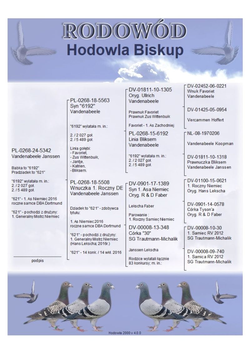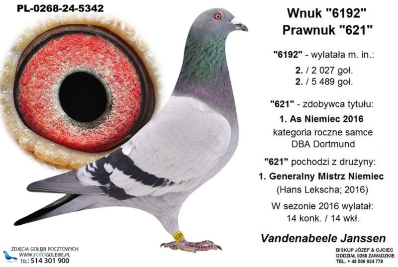 Babka to "6192"; Pradziadek to "621"; "6192" wylatała m. in.: 2. / 2 027 goł., 2. / 5 489 goł.; "621" - 1. As Niemiec 2016