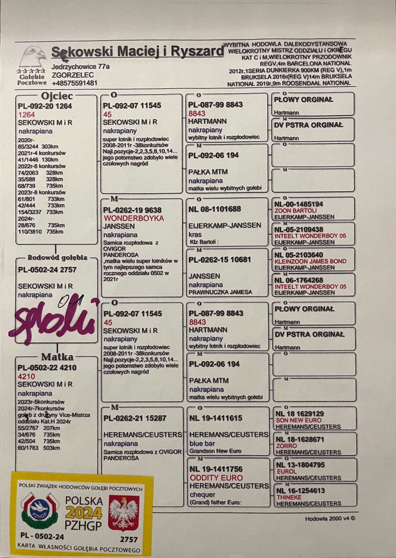 Oryginalny gołąb z hodowli Mariusza Zawadzkiego. Wysyłka po wcześniejszej wpłacie na konto. Możliwość odbioru na Wystawie Ogólnopolskiej.