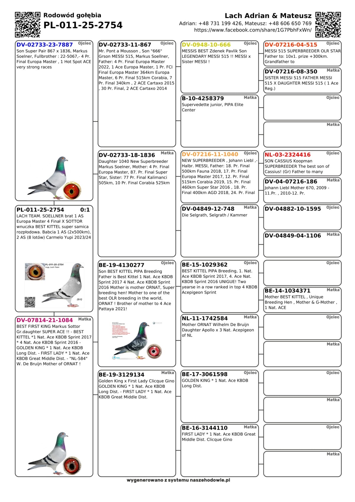 LACH TEAM. SOELLNER brat 1 AS Europa Master 4 Finał X SOTTOR wnuczka BEST KITTEL super samica rozpłodowa. Babcia 1 AS (2x500km), 2 AS (8 lotów) Carmelo Yupi 2023/24 Szczegóły pochodzenia w rodowodzie i załączonych materiałach. Gołębie po kuracjach i szczepieniu. Zapewniamy transport gołębi. Więcej informacji pod nr tel.: +48 731 199 426.
