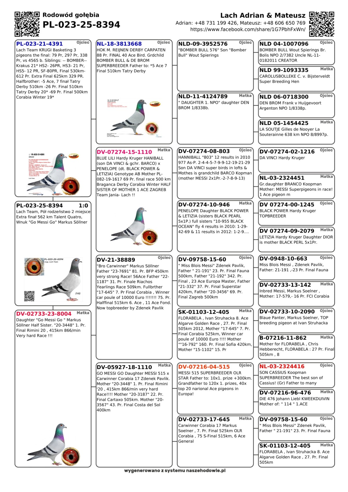Szczegóły pochodzenia w rodowodzie i załączonych materiałach. Gołębie po kuracjach i szczepieniu. Zapewniamy transport gołębi. Więcej informacji pod nr tel.: +48 731 199 426.