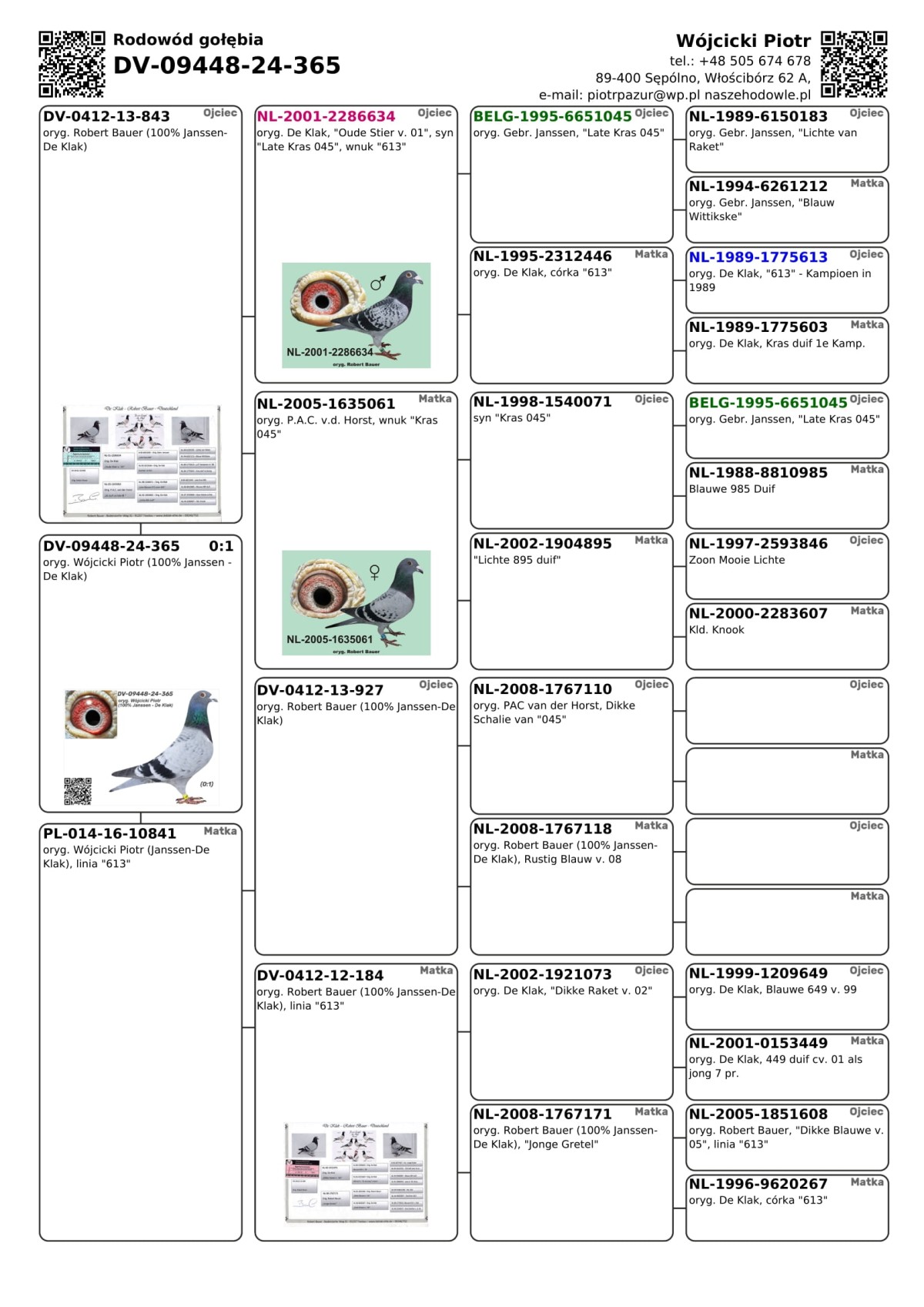 oryg. Wójcicki Piotr (100% Janssen - De Klak) Szczegóły pochodzenia w rodowodzie i załączonych materiałach. Więcej informacji o gołębiach i transporcie pod nr tel.: +48 505 674 678.