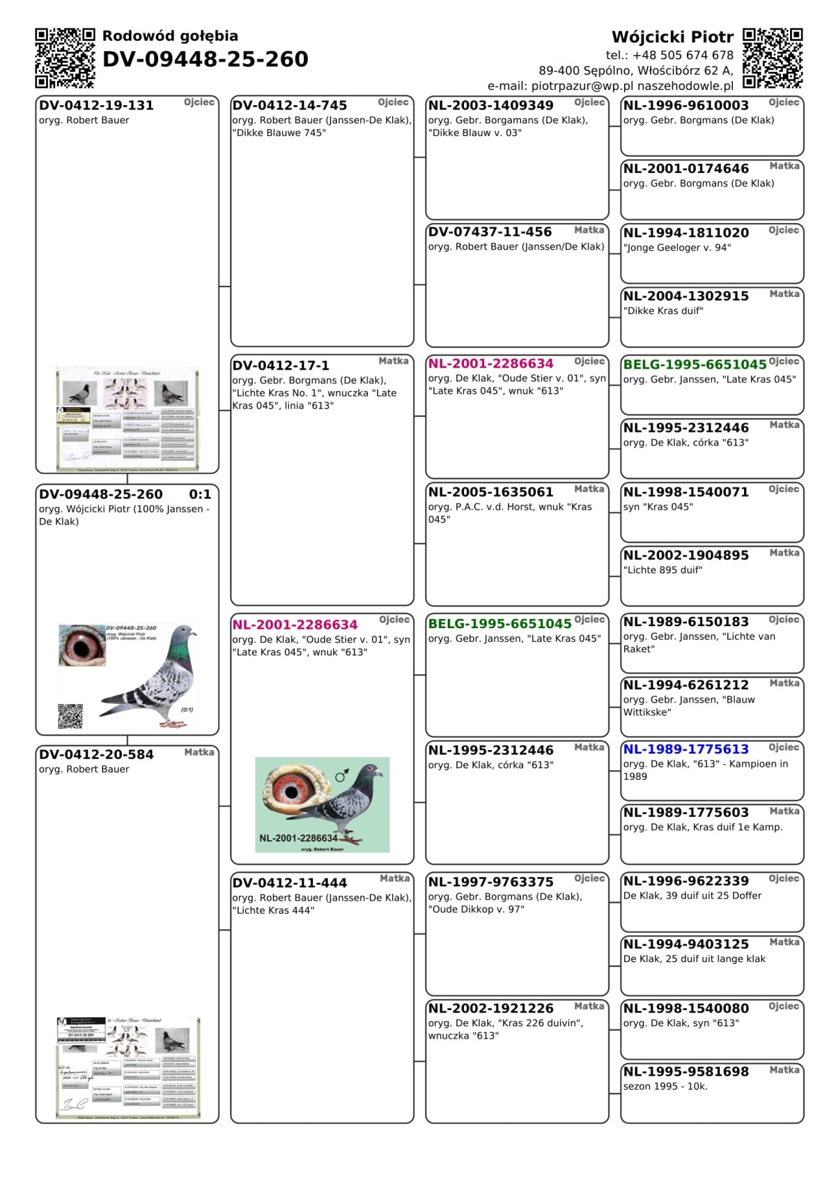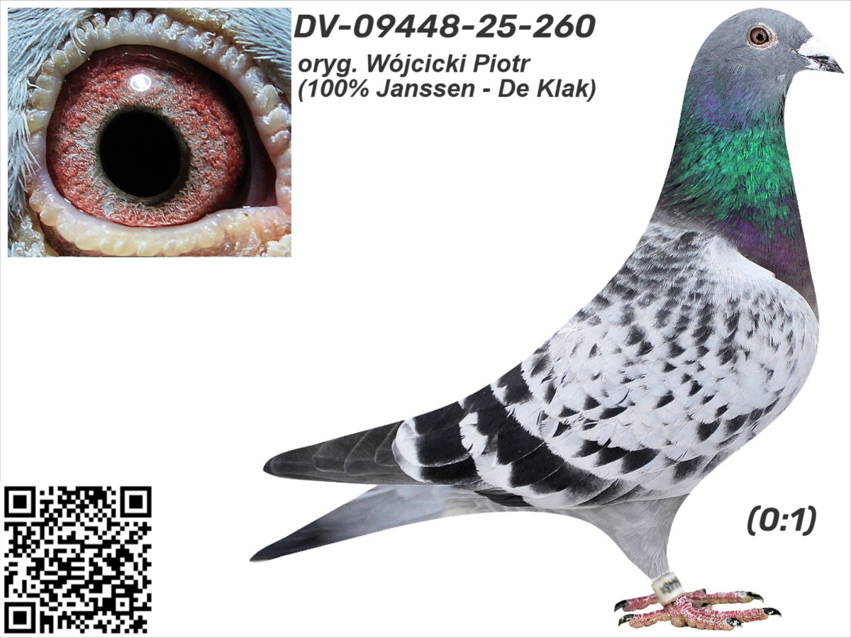 oryg. Wójcicki Piotr (100% Janssen - De Klak) Szczegóły pochodzenia w rodowodzie i załączonych materiałach. Więcej informacji o gołębiach i transporcie pod nr tel.: +48 505 674 678.