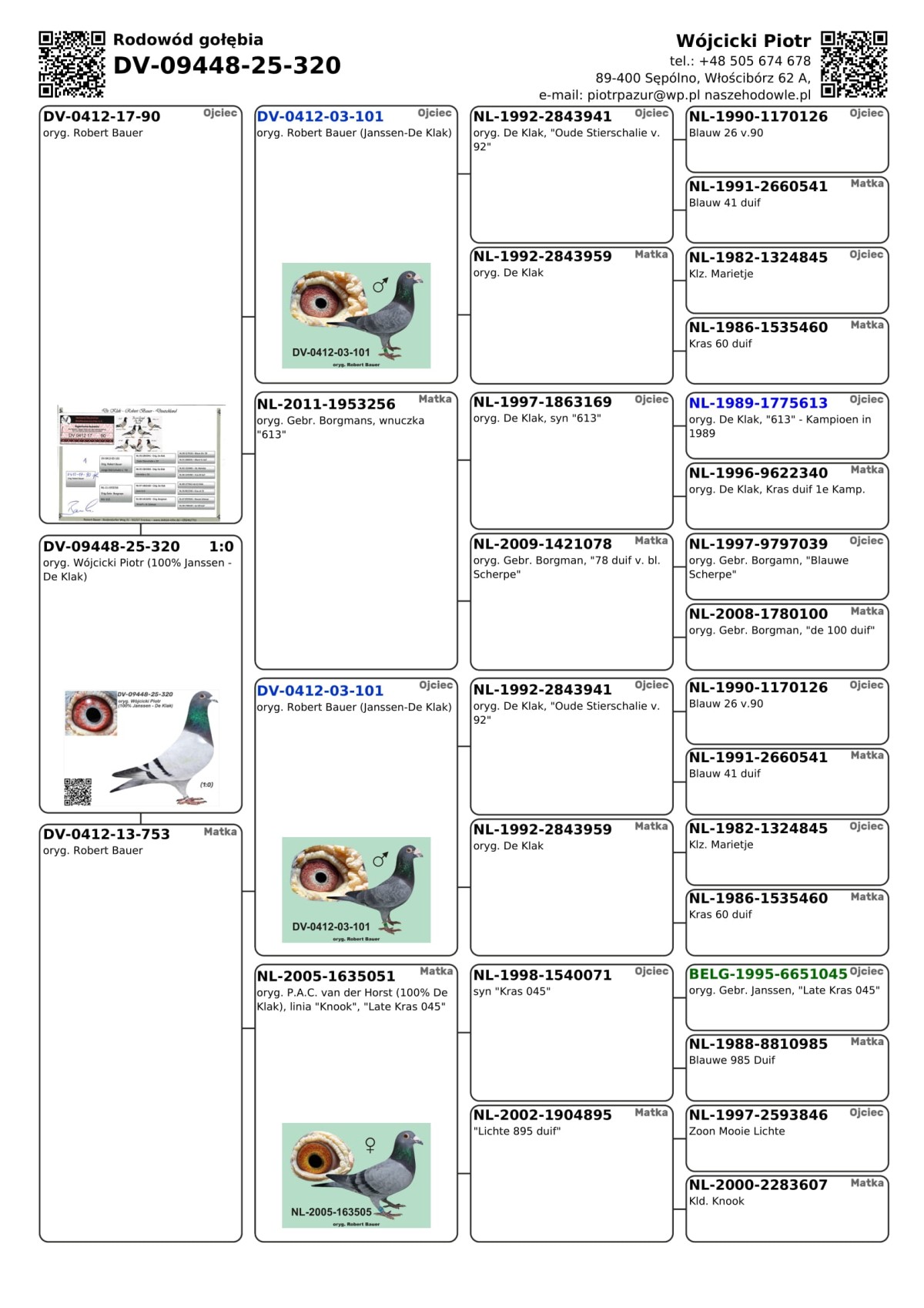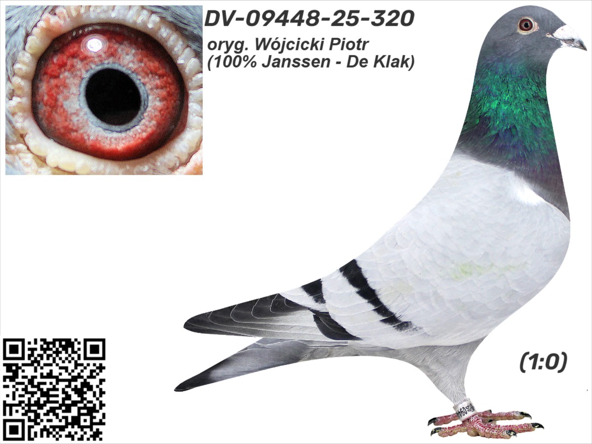oryg. Wójcicki Piotr (100% Janssen - De Klak) Szczegóły pochodzenia w rodowodzie i załączonych materiałach. Więcej informacji o gołębiach i transporcie pod nr tel.: +48 505 674 678.
