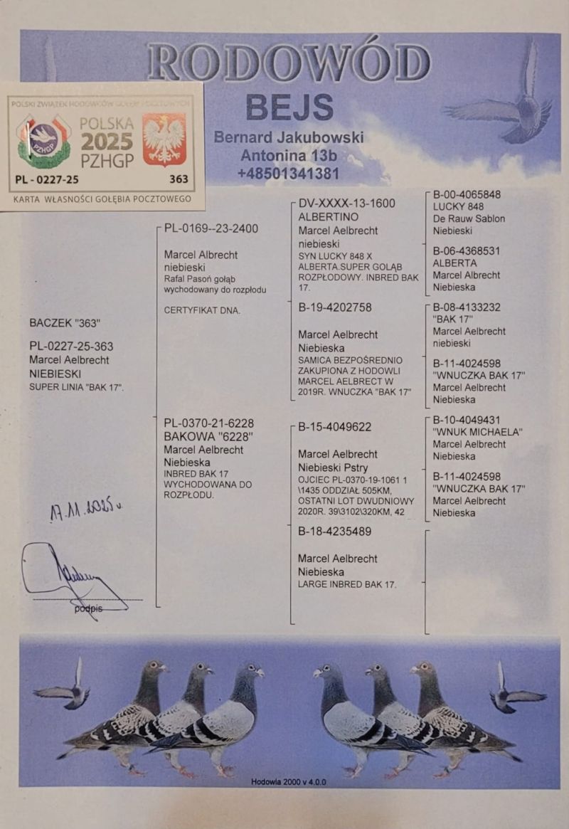 Płeć: młody gołąb Hodowca - rasa: oryg. Bernard Jakubowski Zakończenie: 25.12.2025 godz. 16:38