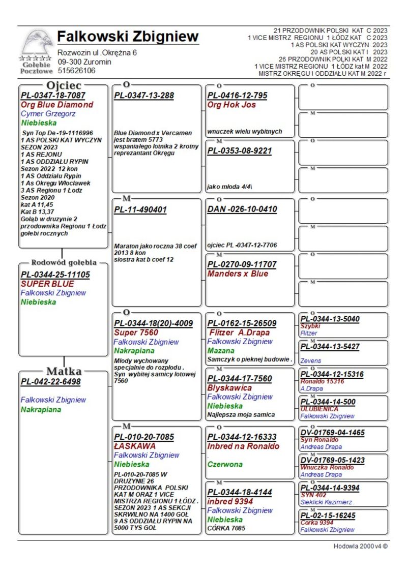 Oryginalny gołąb z hodowli Zbigniewa Falkowskiego. Więcej informacji w rodowodzie oraz pod numerem telefonu: 515 626 106