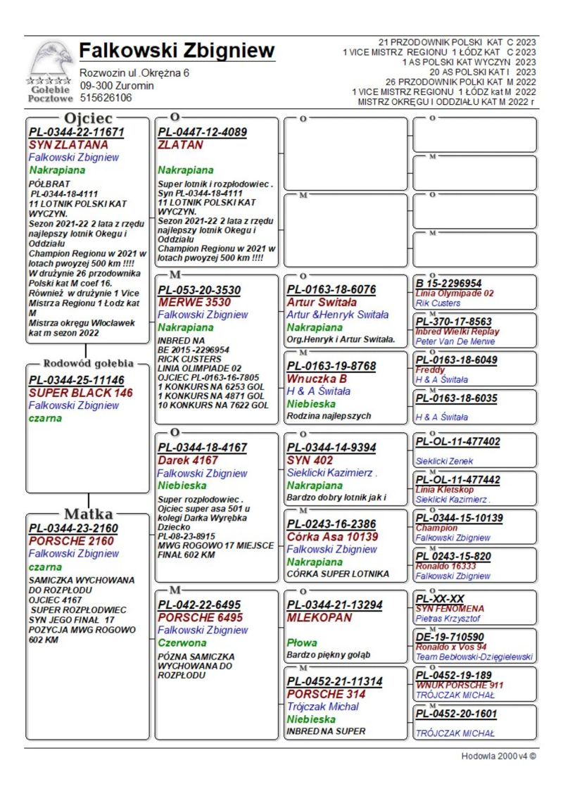 Oryginalny gołąb z hodowli Zbigniewa Falkowskiego. Więcej informacji w rodowodzie oraz pod numerem telefonu: 515 626 106
