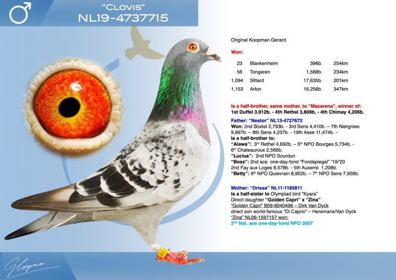Oryginalny gołąb z hodowli Gerard KOOPMAN. Szczegóły pochodzenia w rodowodzie. Gołąb gotowy do sezonu lęgowego, zaszczepiony przeciwko paramyksowirozie (Columba) i salmonellozie (Salmo PT). Więcej informacji pod nr tel.: 669 404 144. Wpłata za gołębia na konto po zakończeniu aukcji. Możliwy odbiór osobisty lub dostawa realizowana przez kuriera w cenie 160 zł. Możliwy także odbiór na wystawie Ogólnopolskiej w Katowicach (sobota lub niedziela).
