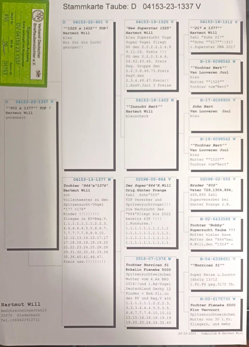 Szczegółowe pochodzenie oferowanego gołębia zostało przedstawione na załączonym rodowodzie