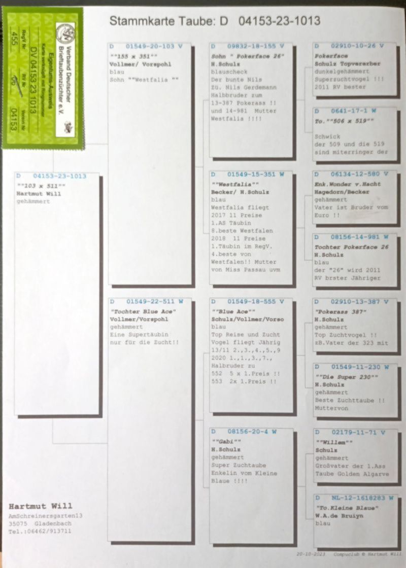 Szczegółowe pochodzenie oferowanego gołębia zostało przedstawione na załączonym rodowodzie