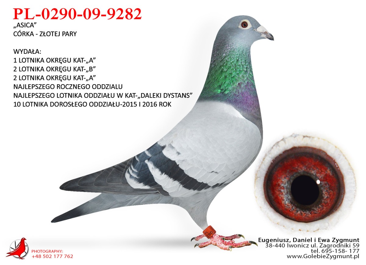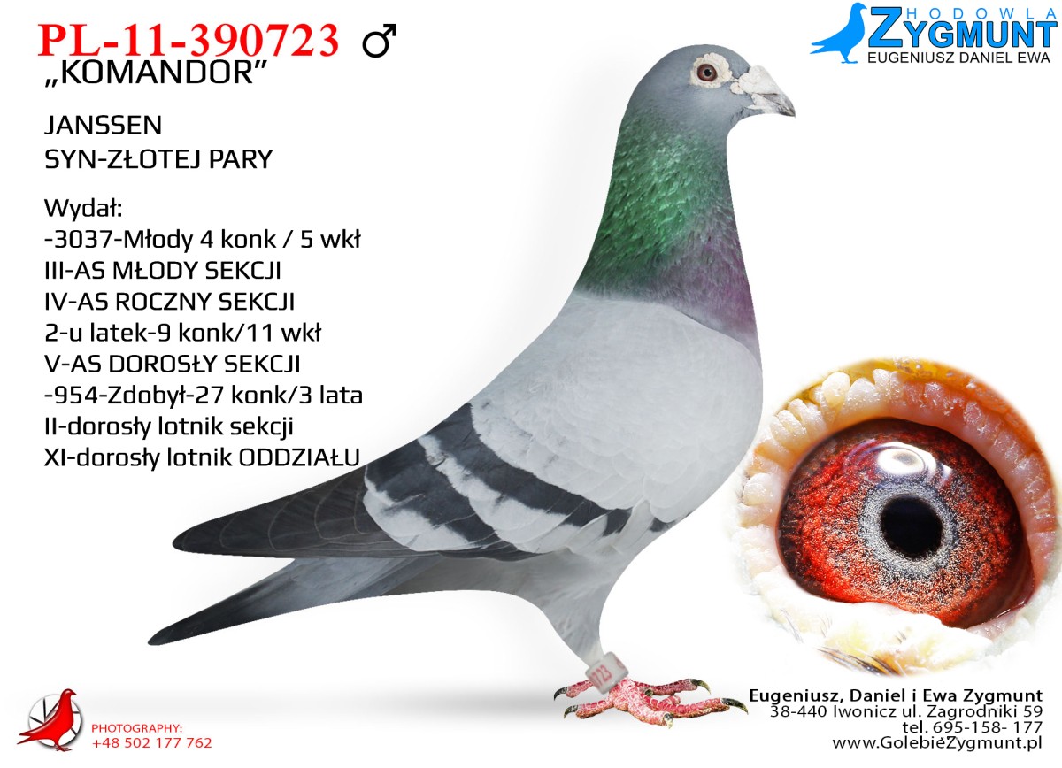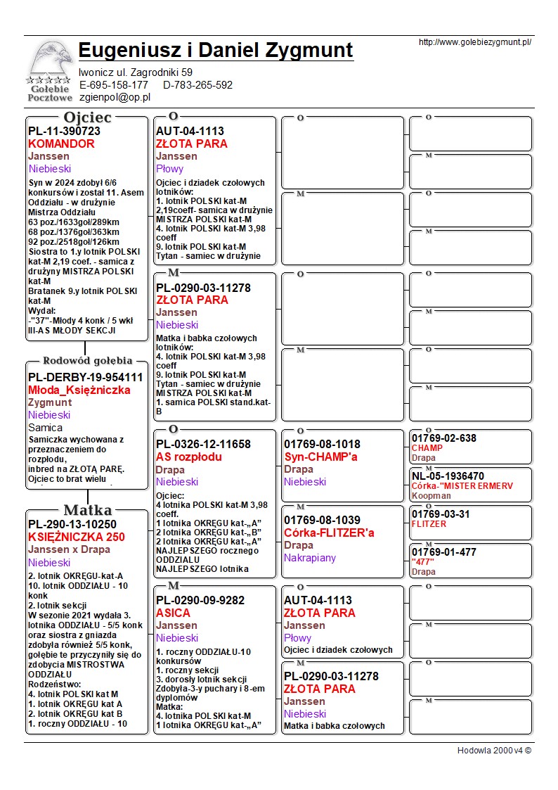 Gołąb o ogromnej wartości hodowlanej, do budowania linii.***Możliwość odbioru na wystawie ogólnopolskiej w Katowicach***Transport: do 2 sztuk – 100 zł, 3–4 sztuki – 150 zł, powyżej 5 sztuk – 200 zł---Sezon 2025 przyniósł kolejne świetne wyniki – zdobyliśmy 4. i 5. miejsce w oddziale oraz tytuł II vice-mistrza oddziału w kategoriach MP oraz kat-A. Na wspólnych gołębnikach nasze ptaki pokazały klasę: 3. miejsce w finale WG Zatoka Puck, 7. AS WG Zatoka Puck, 36. AS OLR SuperCup, 33. i 86. AS OLR Mazury oraz 11. miejsce drużynowo na WG Zatoka Puck. Poprzedni sezon 2024 był jednym z najlepszych w naszej historii – 1., 3. i 4. miejsce w oddziale to wynik, jakiego jeszcze nie było. Do tego 1. i 2. miejsce w kat. MP oraz 1. w kat. A. Sezon zakończyliśmy z 9 gołębiami z 6 konkursami (w tym 5 pierwszych w oddziale) i aż 86 gołębiami z ponad 4 konkursami. Na wspólnych gołębnikach również liczne sukcesy: 2. z finału OLR Mazury, 16. z Ekstra Finału WG Zatoka Puck, 12. z MWG Rogowo, 2. z WG Zatoka Puck, 70. z finału MWG Rogowo, 43. AS Rogowo, 55. z finału OLR SuperCup, 36. AS WG Podhale, a gołąb po naszym samcu zdobył 2. miejsce w finale OLR SuperCup. Więcej informacji w rodowodach lub pod numerem telefonu 783 265 592.