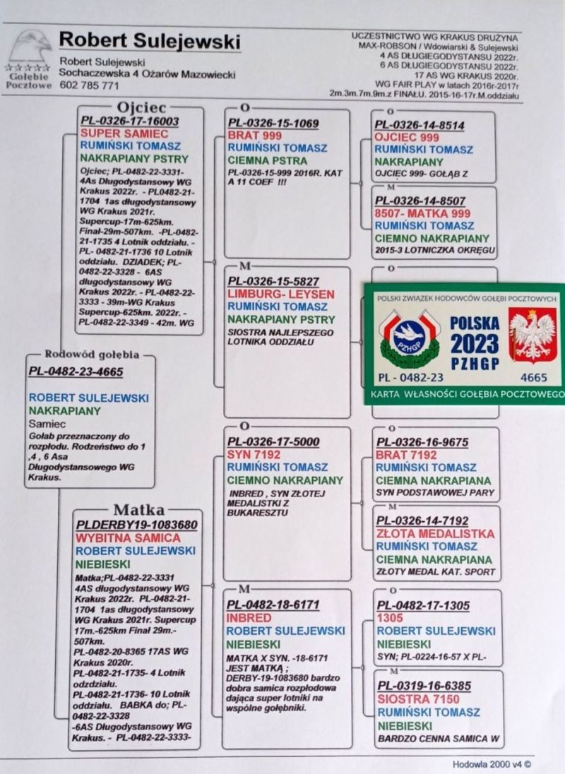 Oryg.Gołąb z hodowli Robert Sulejewski podarowany przez kol.Krzysztof Kondryszyn.Szczegóły pochodzenia w rodowodzie lub pod nr.tel.607 707 001