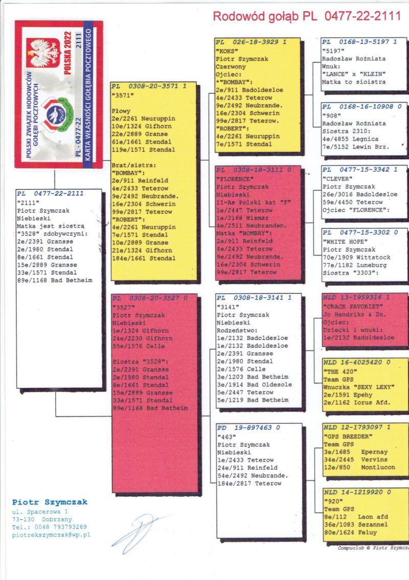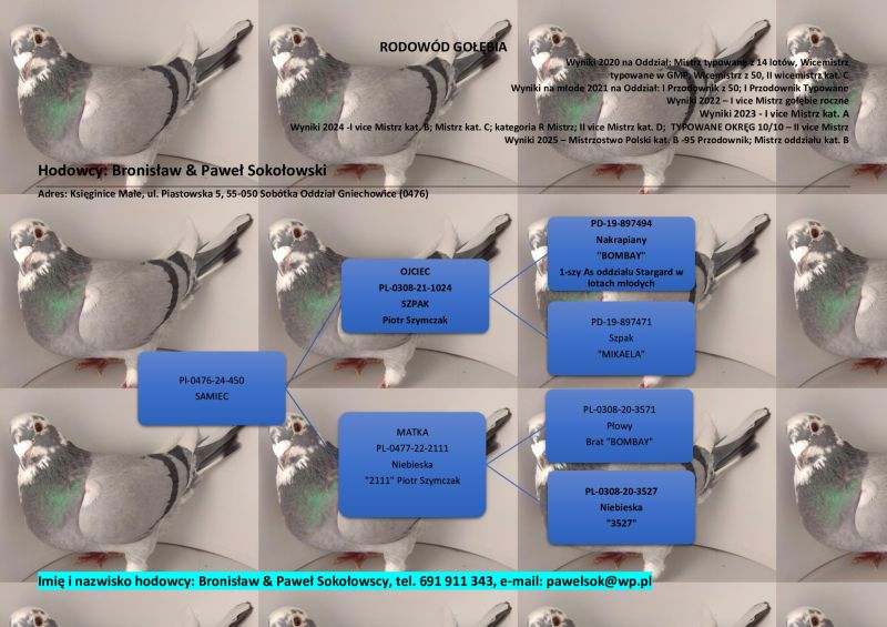 Z racji tego, iż od dwóch lat lotujemy tylko i wyłącznie samicami do odstąpienia mamy nadwyżkę samców z roku 2025 i 2024 – gołębie te były lotowane jako młode i przeszły cały program lotowy. Gołębie roczne w 2025 roku były partnerami do samic lotowych. Gołębie wywodzą się z naszych najlepszych gołębi lotowych i rozpłodowych – szczegóły w rodowodach. Istnieje możliwość po wylicytowaniu ich, na odebranie gołębi na Międzynarodowych Targach Gołebi Pocztowych w EXPOGołębie w Katowicach w dniu 10.01.2026 W tym rok 2025 lotując tylko 33 samicami zdobyliśmy: MISTRZOSTWO POLSKI KATEGORIA „B” -95 Przodownik; MISTRZOSTWO REGIONU V 2025 - KATEGORIA "B"-14 Przodownik MISTRZOSTWO OKRĘGU WROCŁAW 2025 KATEGORIA "B"- 6 Przodownik MISTRZ ODDZIAŁU 2025 KATEGORIA "B Kategoria Wystawowa Sport A -2, 3, 12. 24, 36 gołąb Kategoria Wystawowa Sport B -1, 4, 5, 14, 44 gołąb Kategoria Wystawowa Sport D – 2, 4, 5, 23 gołąb Kategoria Wystawowa Sport W – 8, 11, 12, 13, 17, 22, 32 gołąb Kategoria Wystawowa Olimpijski Standard Samice – 5, 6, 8 ,9, 10, 13, 16, 22, 57 gołąb