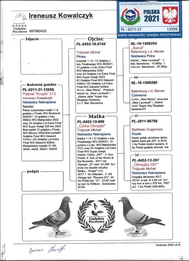 Oryginalny gołąb z hodowli Ireneusz Kowalczyk. Szczegóły pochodzenia w rodowodzie. Więcej informacji pod numerem telefonu: 664 936 030 - Transport prywatnym kurierem lub odbiór na wystawie ogólnopolskiej.