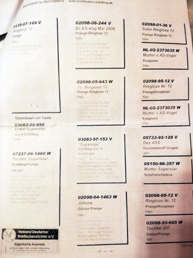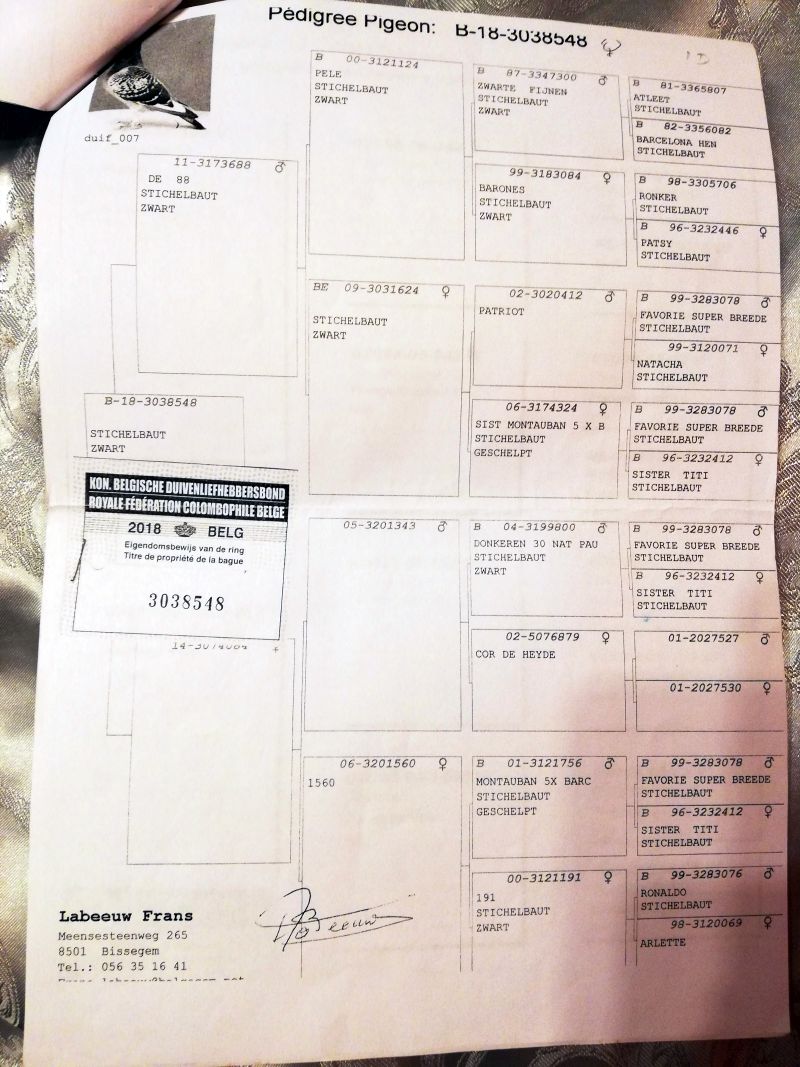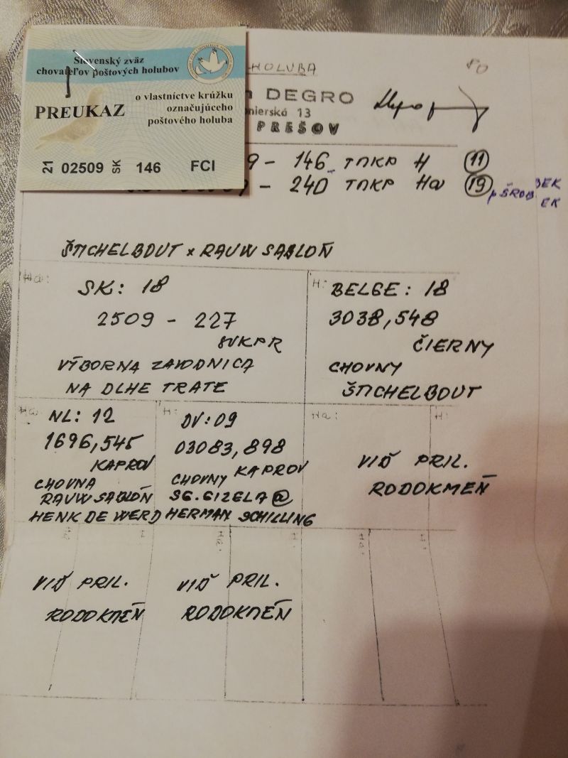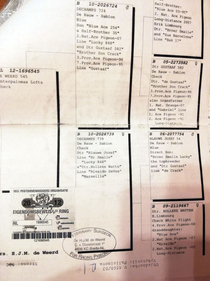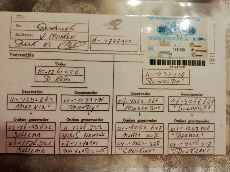 Oryginalny gołąb z hodowli Imrich Degro. Linia gołębi wytrwałych i pewnych jakościowo. Bogaty rodowód. Dodaje w gratisie samiczkę (NL-16-1747900 - rodowód poniżej), której hodowca w tym roku wygrał lot narodowy Holandii z PAU. Oddaje z uwagi na wiek, znosi jajka. Tel: 537380437