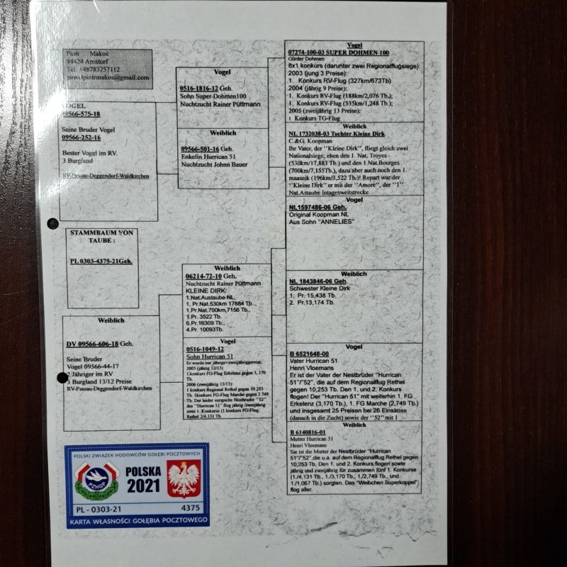 Samiczka od Br. Makoś bardzo ładna w budowie i pięknym oku. Samiczka jest z linii Hurrican 51, Super Dohmen, Kleine Dirk.Gołębie te bardzo dobrze spisują się u Piotrka Bugały, polecam do dalszej hodowli gołąb po kuracjach gotowy do parowania, transport kurierem ok 100-150 zł