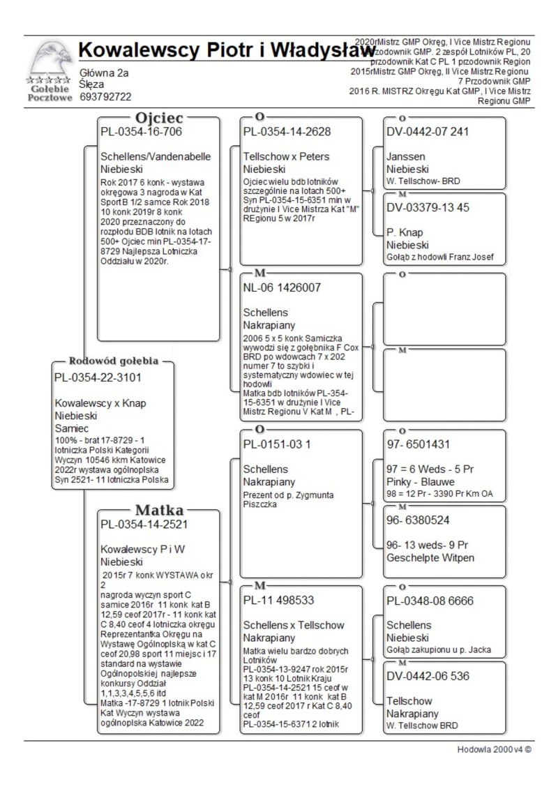 Oryginalny gołąb z hodowli Piotra i Władysława Kowalewskich, czołowej hodowli okręgu Wrocław. Szczegóły pochodzenia w rodowodzie. Więcej informacji pod nr tel.: 693 792 722. Dostawa gołębi kurierem lub odbiór osobisty. Możliwy jest także odbiór na wystawie Ogólnopolskiej w Katowicach (preferowana opcja).