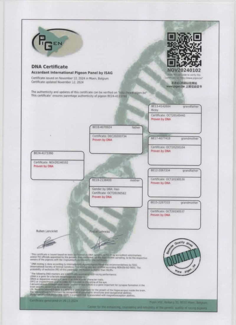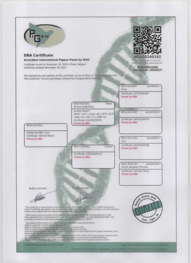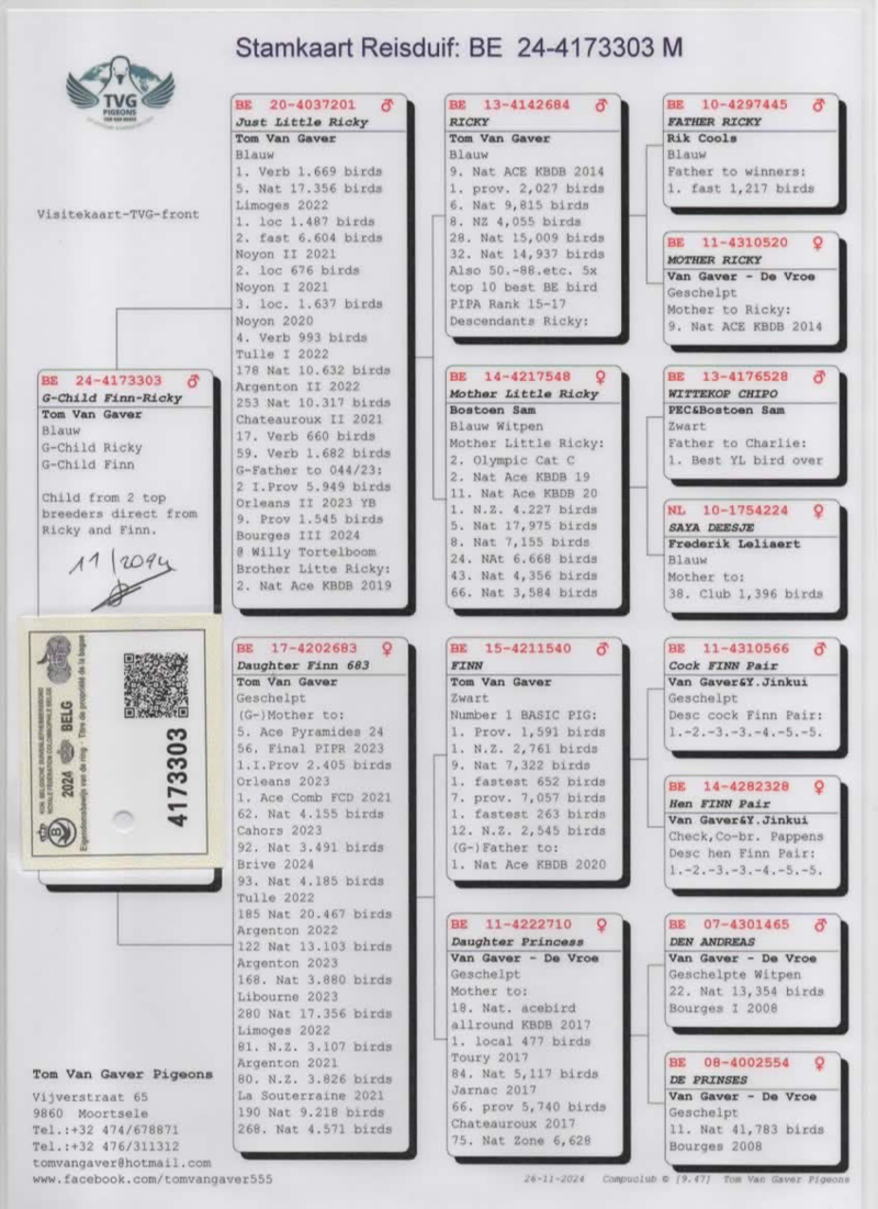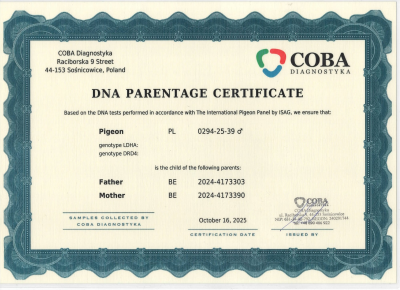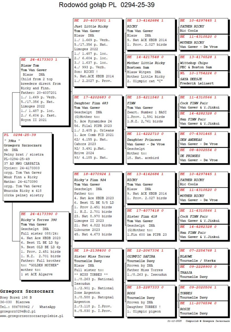 Ofertowany samczyk to potwierdzony cert. DNA po dwóch oryg. gołębiach od Toma Van Gavera, pełny brat 37 AS MWG Carpatia w 2025 r. Samczyk bardzo ładnej budowy i super pochodzeniu. Ojcem jest syn Ricky x córka Finna, matka po pełna siostra 4 As KBDB w 2023 wnuczka Ricky oraz córka siostry "Miss Torres" od Davy Tournelle. Rodzice potwierdzone certyfikatami DNA. Możliwy odbiór osobisty, kurierem lub na wystawie Ogólnopolskiej piątek-sobota.
