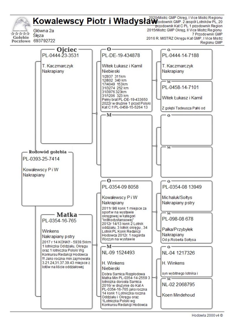 Oryginalny gołąb z hodowli Piotra i Władysława Kowalewskich, czołowej hodowli Okręgu Wrocław. Szczegóły pochodzenia w rodowodzie. Więcej informacji pod nr tel.: 693 792 722. Dostawa gołębi kurierem lub odbiór osobisty. Możliwy jest także odbiór na wystawie Ogólnopolskiej w Katowicach (preferowana opcja).