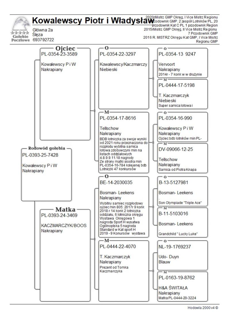 Oryginalny gołąb z hodowli Piotra i Władysława Kowalewskich, czołowej hodowli Okręgu Wrocław. Szczegóły pochodzenia w rodowodzie. Więcej informacji pod nr tel.: 693 792 722. Dostawa gołębi kurierem lub odbiór osobisty. Możliwy jest także odbiór na wystawie Ogólnopolskiej w Katowicach (preferowana opcja).