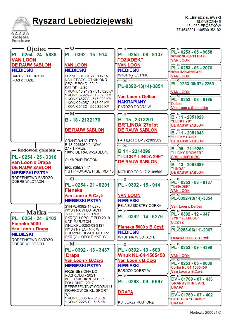 *prawdopodobnie samiec** Oryginalny gołąb z hodowli Ryszard Lebiedziejewskiego. Szczegóły pochodzenia w rodowodzie. Więcej informacji pod nr tel.: 530 152 182. **Gołębie po kuracjach przygotowane do sezonu. **Transport gołębi prywatnym kurierem 130 zł do 3 szt. od 4szt do 6szt 150zł. Możliwość odbioru na Ogólnopolskiej Wystawie Gołębi Pocztowych w Katowicach, w sobotę (10.01.2026r)