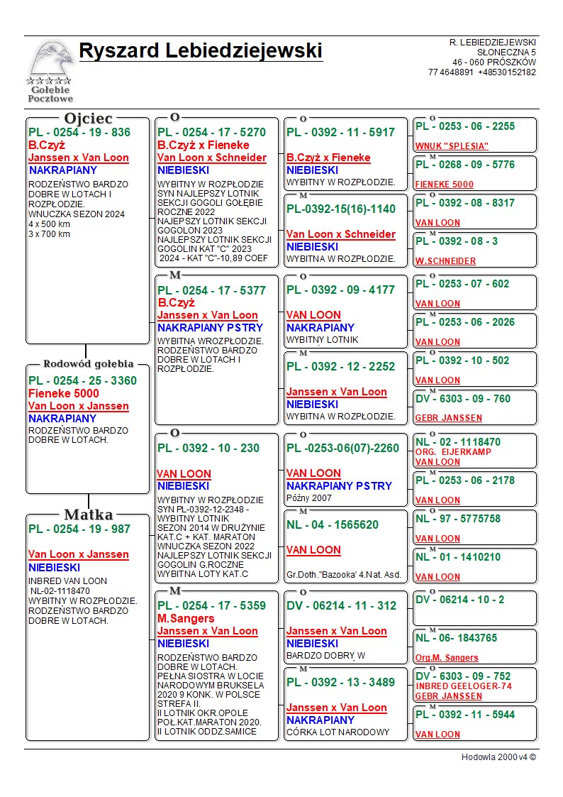 *prawdopodobnie samica** Oryginalny gołąb z hodowli Ryszard Lebiedziejewskiego. Szczegóły pochodzenia w rodowodzie. Więcej informacji pod nr tel.: 530 152 182. **Gołębie po kuracjach przygotowane do sezonu. **Transport gołębi prywatnym kurierem 130 zł do 3 szt. od 4szt do 6szt 150zł. Możliwość odbioru na Ogólnopolskiej Wystawie Gołębi Pocztowych w Katowicach, w sobotę (10.01.2026r)