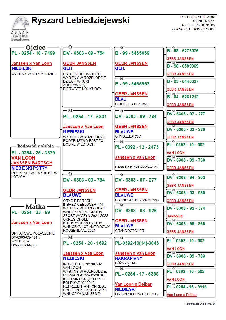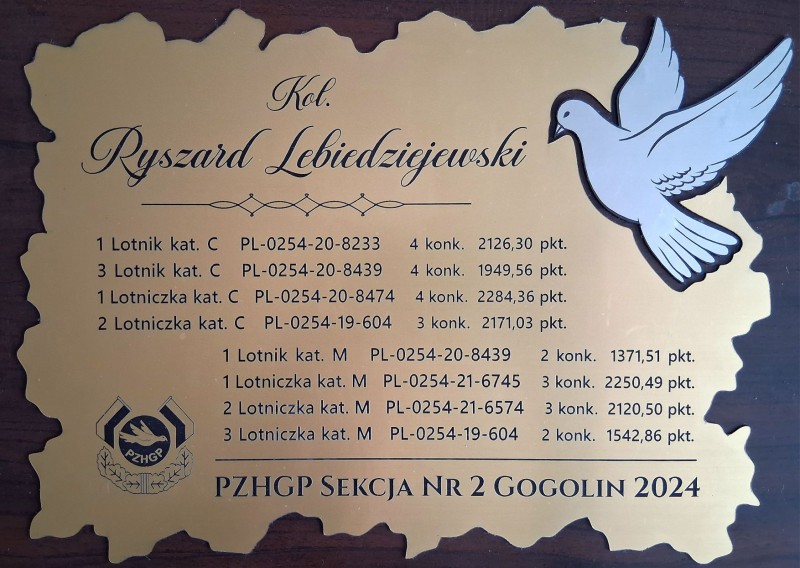 *prawdopodobnie samica** Oryginalny gołąb z hodowli Ryszard Lebiedziejewskiego. Szczegóły pochodzenia w rodowodzie. Więcej informacji pod nr tel.: 530 152 182. **Gołębie po kuracjach przygotowane do sezonu. **Transport gołębi prywatnym kurierem 130 zł do 3 szt. od 4szt do 6szt 150zł. Możliwość odbioru na Ogólnopolskiej Wystawie Gołębi Pocztowych w Katowicach, w sobotę (10.01.2026r)