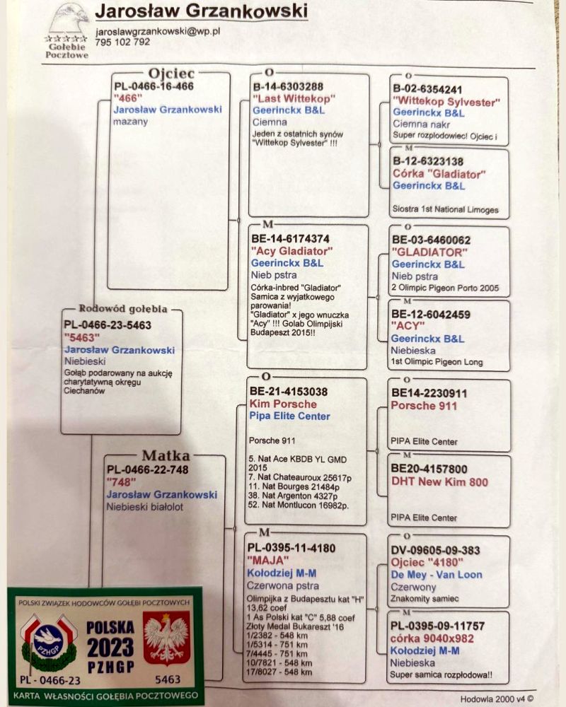 Oryginalny gołąb z hodowli Jarosława Grzankowskiego, gołąb znajduje się w hodowli Arkadiusz Mochtak. Szczegóły pochodzenia w rodowodzie. Więcej informacji pod nr tel.: 690 393 441