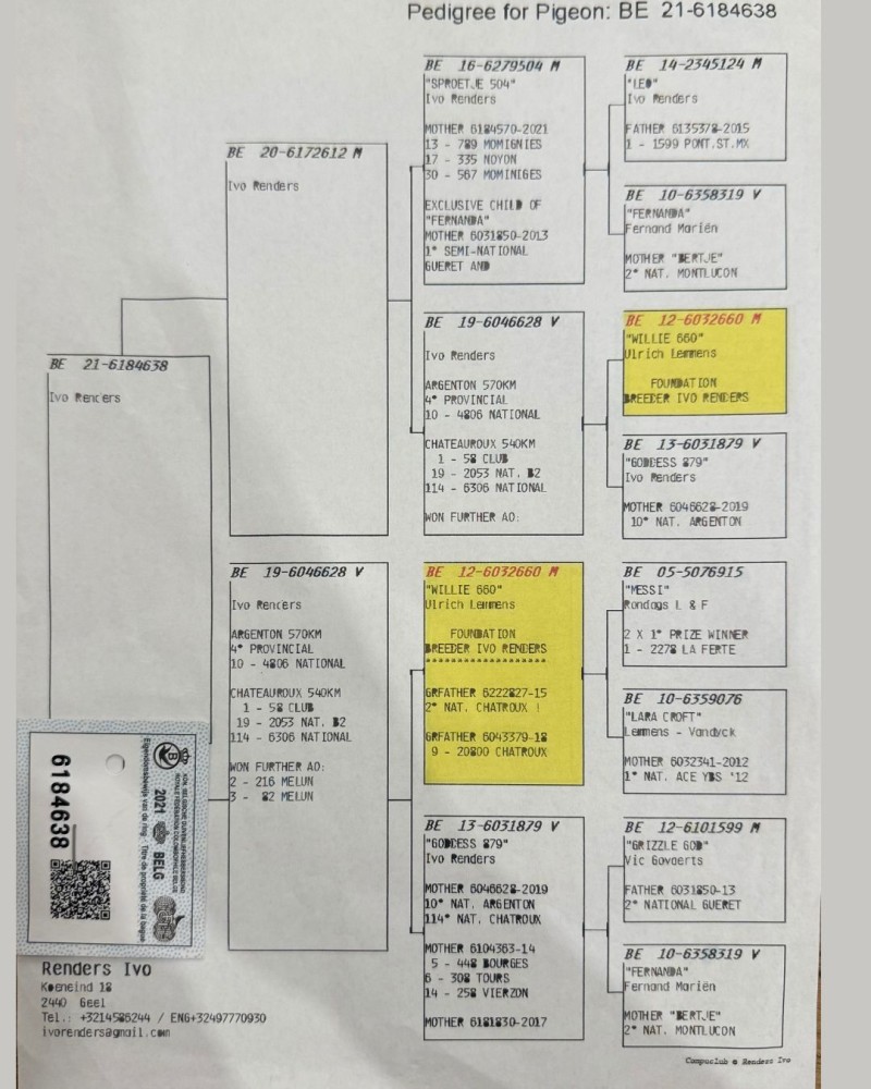 Oryginalny gołąb z hodowli Ivo Renders, gołąb znajduje się w hodowli Arkadiusz Mochtak. Szczegóły pochodzenia w rodowodzie. Więcej informacji pod nr tel.: 690 393 441