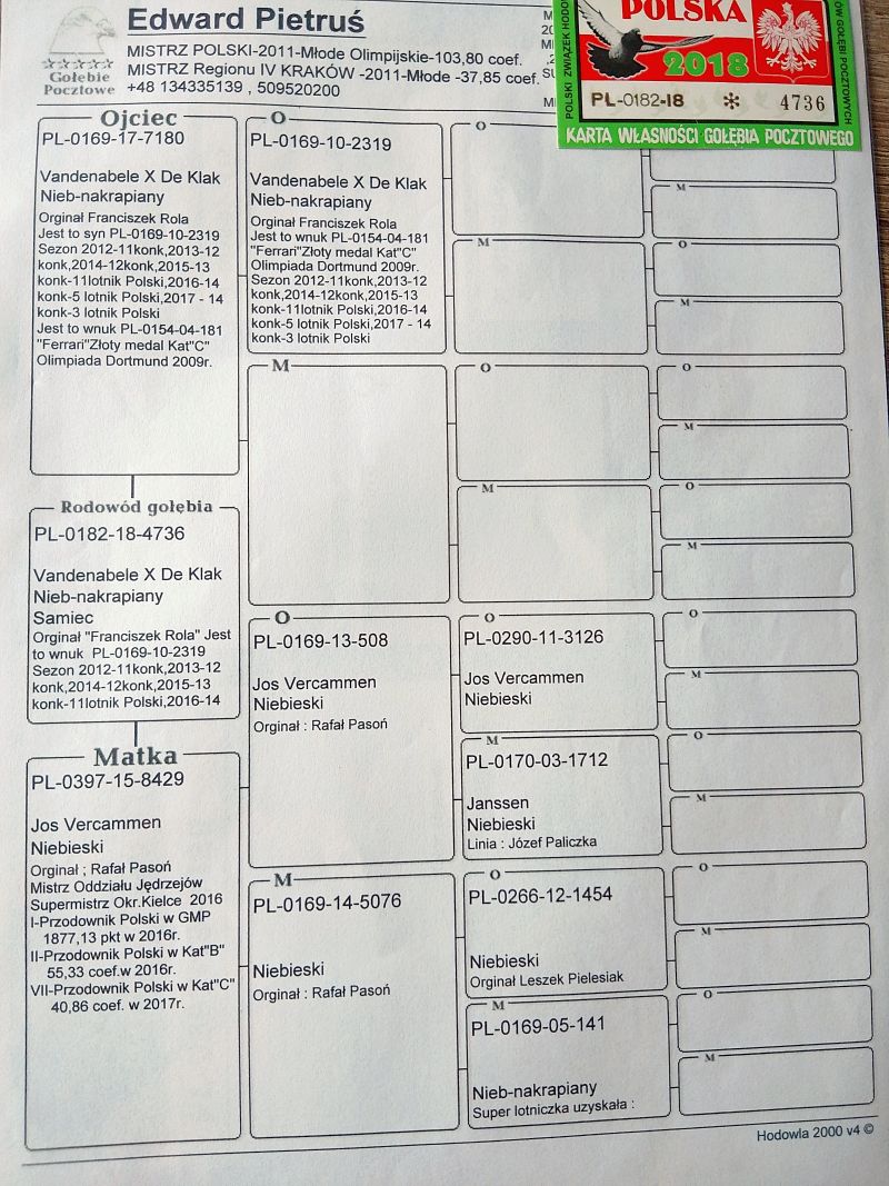 Oryginalny gołąb z hodowli Edwarda Pietrusia. Szczegóły pochodzenia w rodowodzie. Więcej informacji pod nr tel.: 539 388 801 *możliwość wysyłki lub odbioru gołębia na wystawie w Katowicach (sobota)
