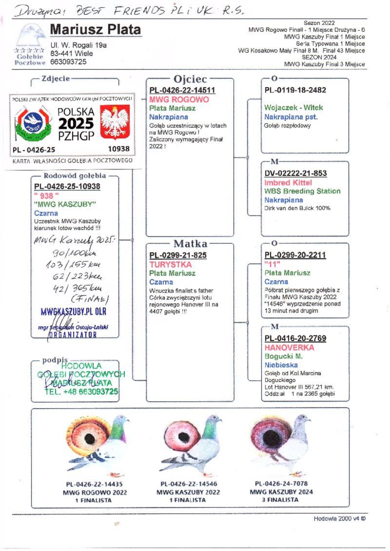 Gołąb (42 MIEJSCE z lotu Finałowego) brał udział w zawodach na Wspólnym Gołębniku KASZUBY. Więcej informacji w rodowodzie i załącznikach. Kontakt do Właściciela Gołębnika tel.601686344 (Sebastian Ostoja-Lniski). Informujemy poza tym, że rozpoczęły się zapisy na sezon 2026. Serdecznie zapraszam do rywalizacji..... Uwaga! Koszty związane z transportem pokrywa nabywca gołębia. W zależności od kuriera wynoszą one około 150zł lub odbiór na Wystawie w Katowicach (w sobotę około 50zł). Można również odebrać gołębia osobiście. Powyżej sylwetki gołębia znajduje się video z jego prezentacją.