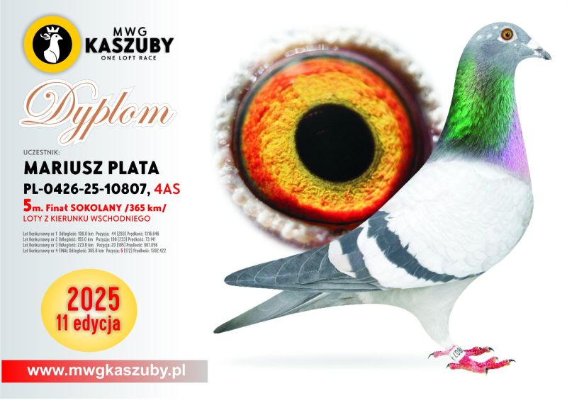Gołąb (40 MIEJSCE z lotu Finałowego) brał udział w zawodach na Wspólnym Gołębniku KASZUBY. Więcej informacji w rodowodzie i załącznikach. Kontakt do Właściciela Gołębnika tel.601686344 (Sebastian Ostoja-Lniski). Informujemy poza tym, że rozpoczęły się zapisy na sezon 2026. Serdecznie zapraszam do rywalizacji..... Uwaga! Koszty związane z transportem pokrywa nabywca gołębia. W zależności od kuriera wynoszą one około 150zł lub odbiór na Wystawie w Katowicach (w sobotę około 50zł). Można również odebrać gołębia osobiście. Powyżej sylwetki gołębia znajduje się video z jego prezentacją.