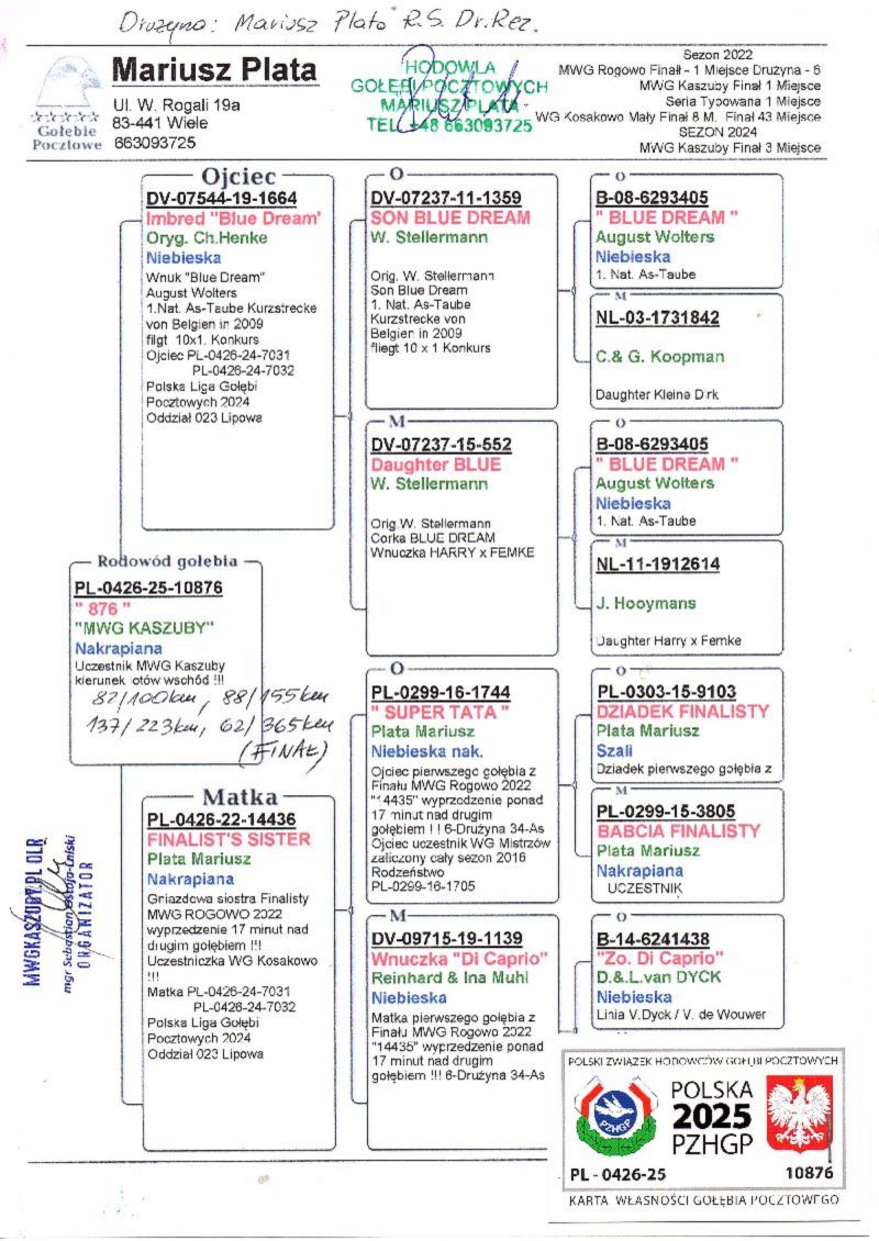 Gołąb (62 MIEJSCE z lotu Finałowego) brał udział w zawodach na Wspólnym Gołębniku KASZUBY. Więcej informacji w rodowodzie i załącznikach. Kontakt do Właściciela Gołębnika tel.601686344 (Sebastian Ostoja-Lniski). Informujemy poza tym, że rozpoczęły się zapisy na sezon 2026. Serdecznie zapraszam do rywalizacji..... Uwaga! Koszty związane z transportem pokrywa nabywca gołębia. W zależności od kuriera wynoszą one około 150zł lub odbiór na Wystawie w Katowicach (w sobotę około 50zł). Można również odebrać gołębia osobiście. Powyżej sylwetki gołębia znajduje się video z jego prezentacją.