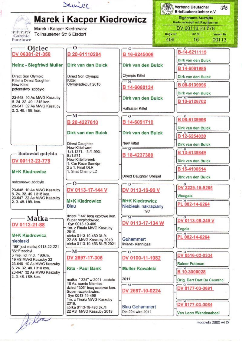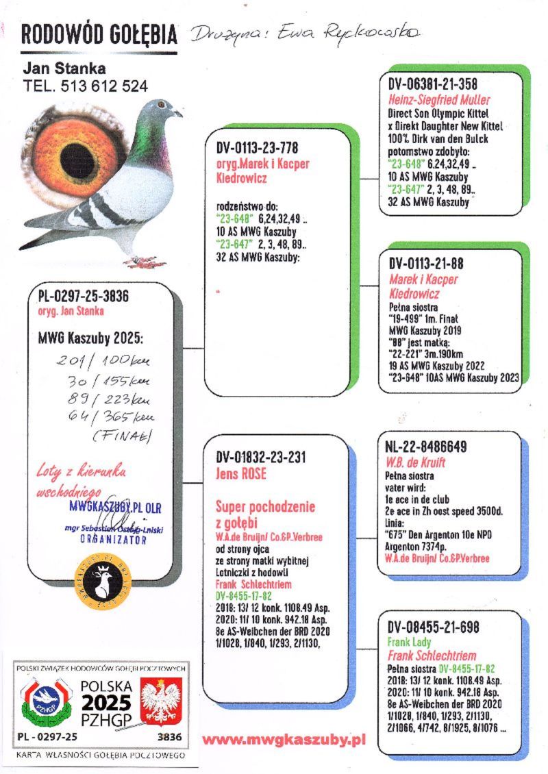 Gołąb (64 MIEJSCE z lotu Finałowego) brał udział w zawodach na Wspólnym Gołębniku KASZUBY. Więcej informacji w rodowodzie i załącznikach. Kontakt do Właściciela Gołębnika tel.601686344 (Sebastian Ostoja-Lniski). Informujemy poza tym, że rozpoczęły się zapisy na sezon 2026. Serdecznie zapraszam do rywalizacji..... Uwaga! Koszty związane z transportem pokrywa nabywca gołębia. W zależności od kuriera wynoszą one około 150zł lub odbiór na Wystawie w Katowicach (w sobotę około 50zł). Można również odebrać gołębia osobiście. Powyżej sylwetki gołębia znajduje się video z jego prezentacją.