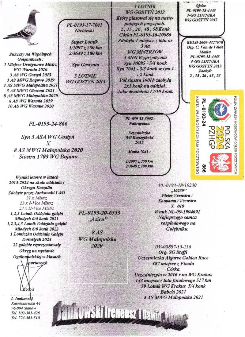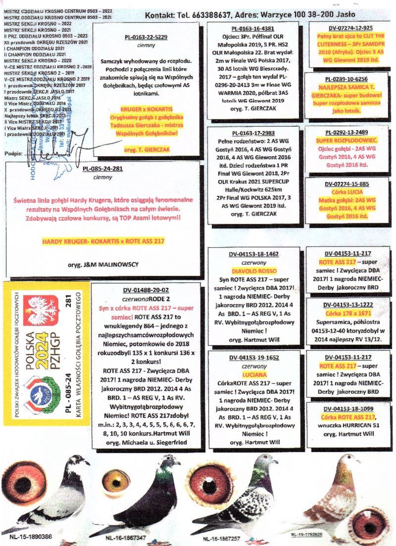 Gołąb (79 MIEJSCE z lotu Finałowego) brał udział w zawodach na Wspólnym Gołębniku KASZUBY. Więcej informacji w rodowodzie i załącznikach. Kontakt do Właściciela Gołębnika tel.601686344 (Sebastian Ostoja-Lniski). Informujemy poza tym, że rozpoczęły się zapisy na sezon 2026. Serdecznie zapraszam do rywalizacji..... Uwaga! Koszty związane z transportem pokrywa nabywca gołębia. W zależności od kuriera wynoszą one około 150zł lub odbiór na Wystawie w Katowicach (w sobotę około 50zł). Można również odebrać gołębia osobiście. Powyżej sylwetki gołębia znajduje się video z jego prezentacją.