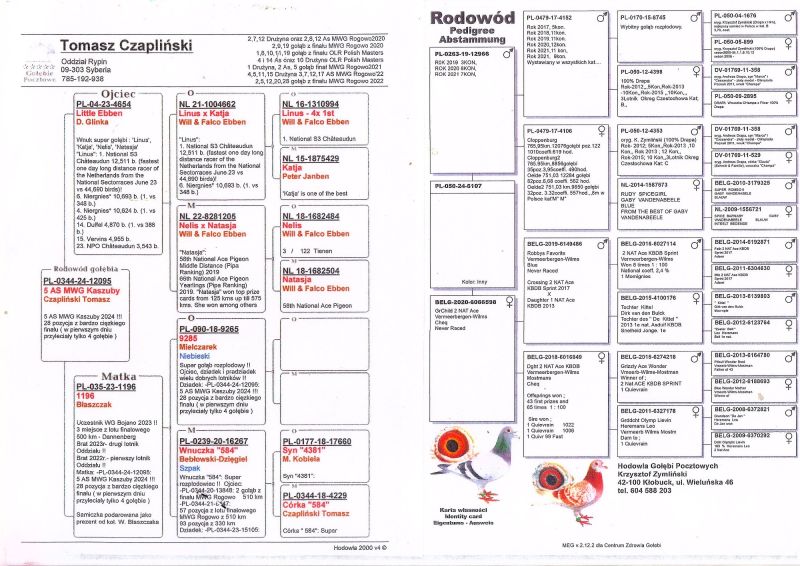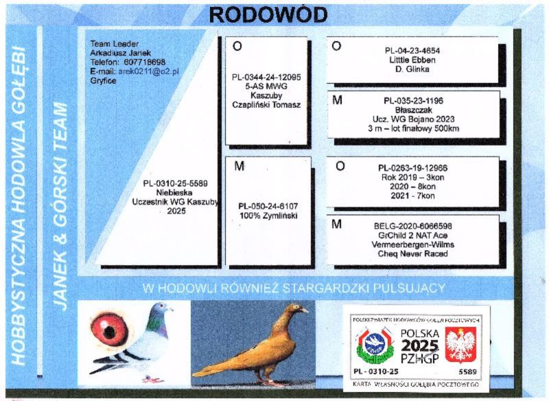 Gołąb brał udział w zawodach na Wspólnym Gołębniku KASZUBY. Więcej informacji w rodowodzie i załącznikach. Kontakt do Właściciela Gołębnika tel.601686344 (Sebastian Ostoja-Lniski). Informujemy poza tym, że rozpoczęły się zapisy na sezon 2026. Serdecznie zapraszam do rywalizacji..... Uwaga! Koszty związane z transportem pokrywa nabywca gołębia. W zależności od kuriera wynoszą one około 150zł lub odbiór na Wystawie w Katowicach (w sobotę około 50zł). Można również odebrać gołębia osobiście. Powyżej sylwetki gołębia znajduje się video z jego prezentacją.