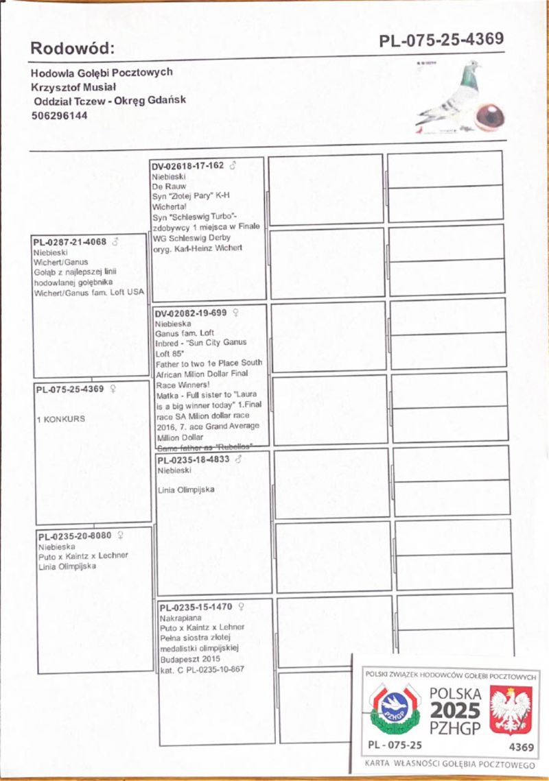 Płeć: młody gołąb Hodowca - rasa: K.Musiał Zakończenie: 31.12.2025 godz. 17:54