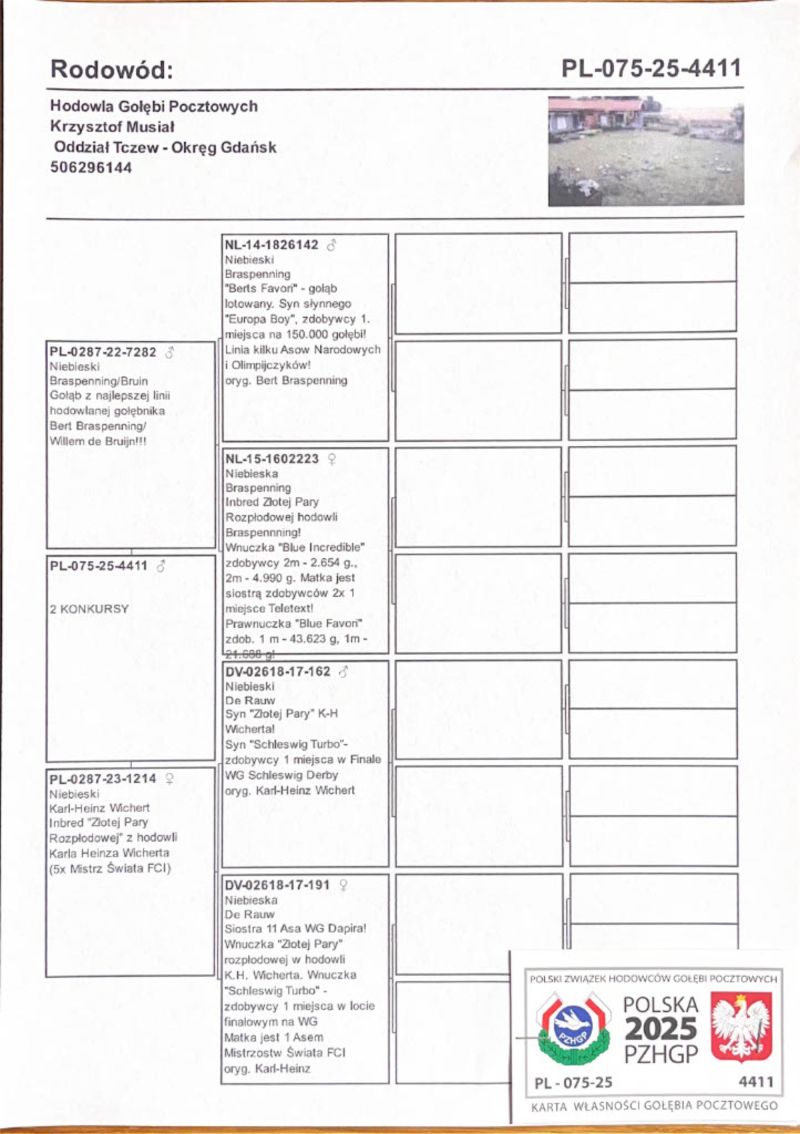 Płeć: młody gołąb Hodowca - rasa: K.Musiał Zakończenie: 31.12.2025 godz. 17:42