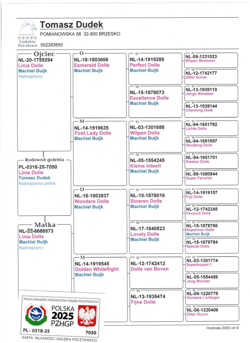 Mamy Państwu do zaoferowania gołębia PL-0318-25-7050 - Machiel Buijk linia Dolle. Więcej informacji pod numerem 502 283 650.