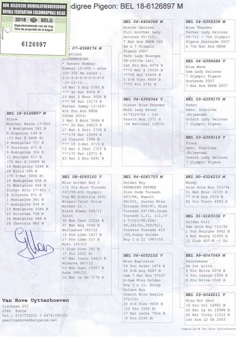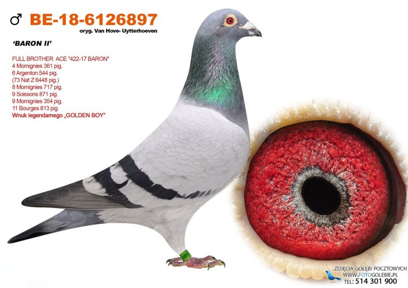 Uwaga! Możliwość odbioru na wystawie w Katowicach w dniach 9-11.01.2026 po wcześniejszej wpłacie na konto bankowe!!. Oryg. gołąb z hodowli Van Hove - Uytterhoeven, szczególy pochodzenia w rodowodzie. Kontakt w sprawie gołębi oraz transportu pod numerem telefonu 798 456 094