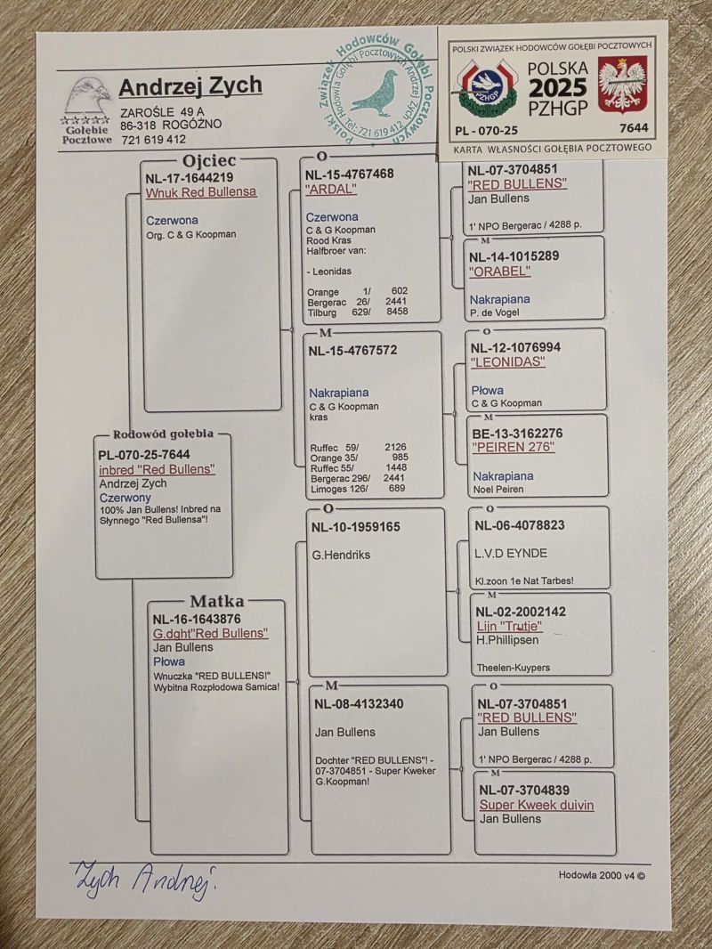 PL-070-25-7644 - 100% Jan Bullens! Super Inbred na Słynnego RED BULLENSA! Super na Maraton! Unikat! Okazja!