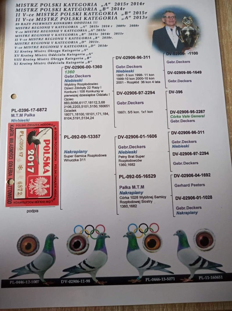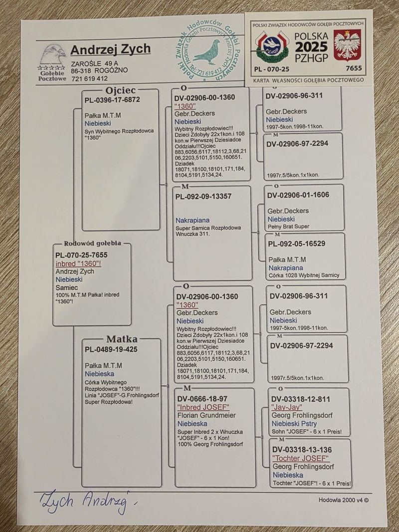 Oryginalny gołąb z hodowli Andrzeja Zycha. Szczegóły pochodzenia zamieszczone w rodowodzie. Więcej informacji pod numerem telefonu: 721 619 412
