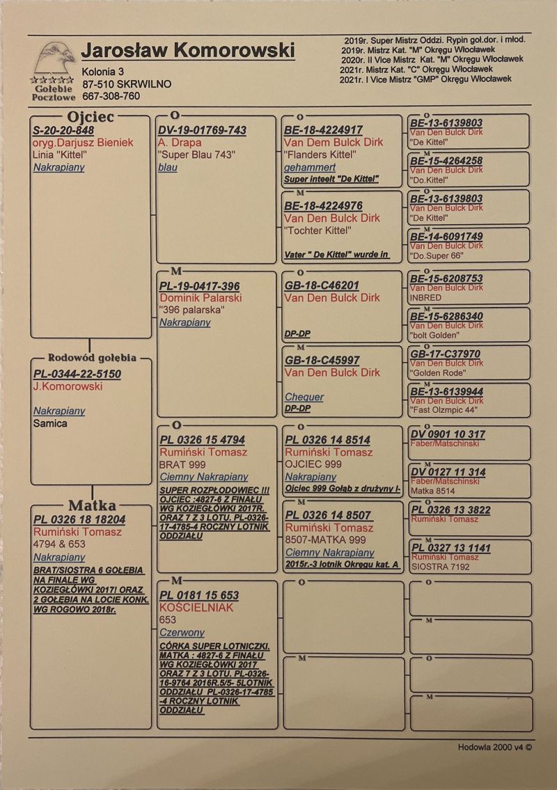 Oryginalny gołąb z hodowli Jarosława Komorowskiego .Więcej informacji w rodowodzie oraz pod numerem telefonu: +48 667 308 760