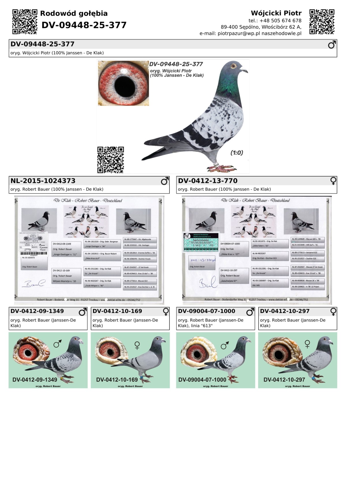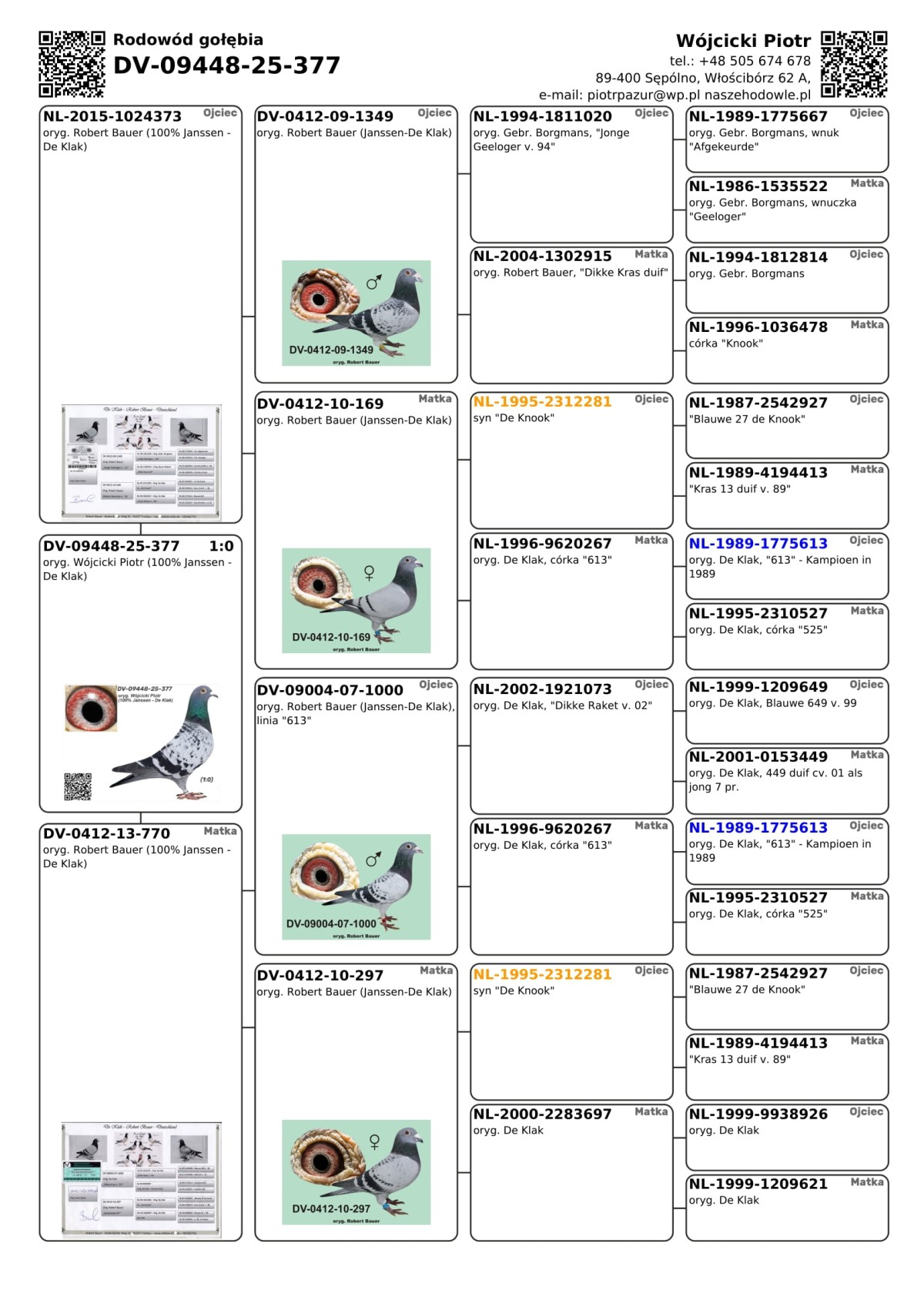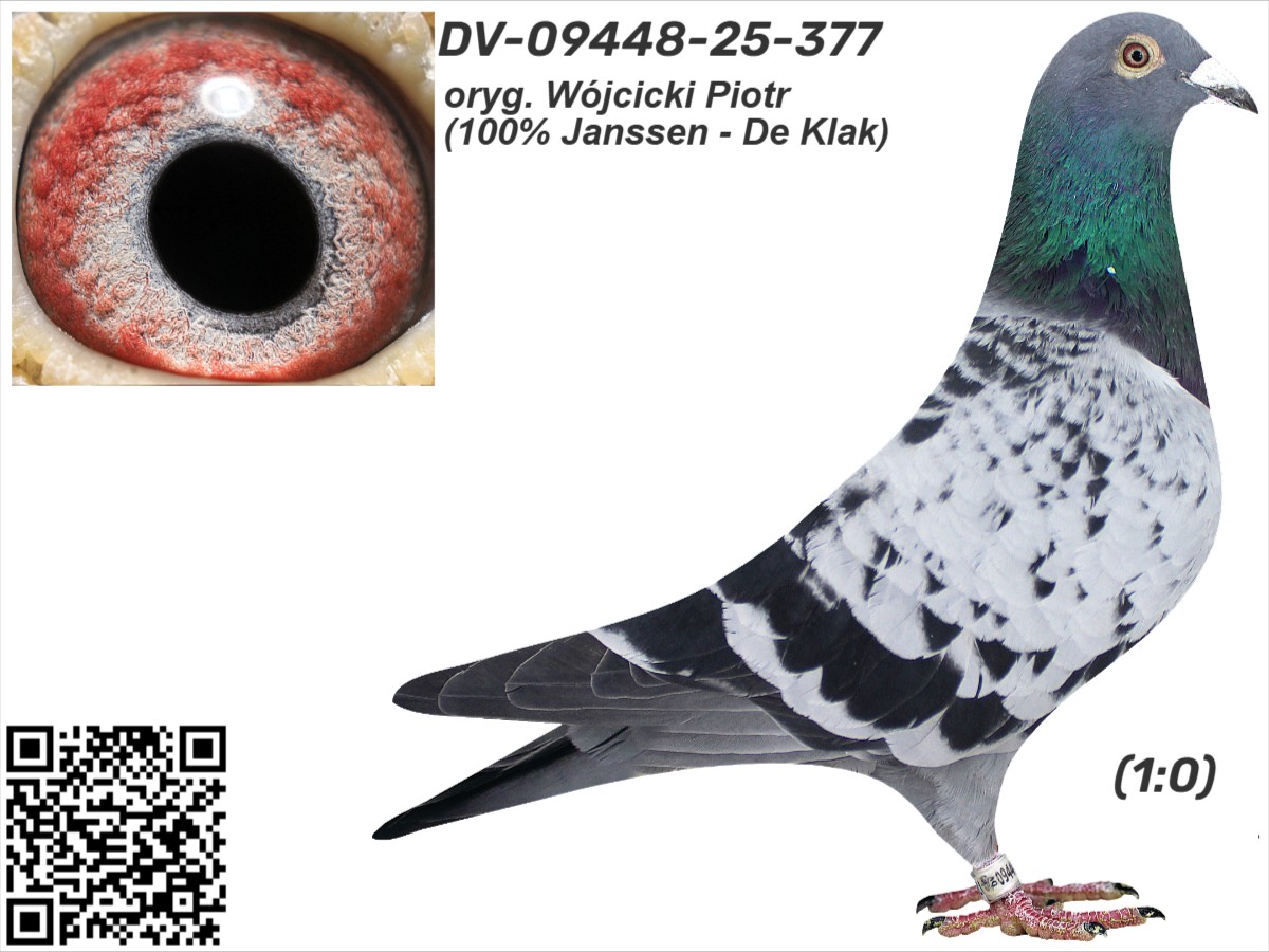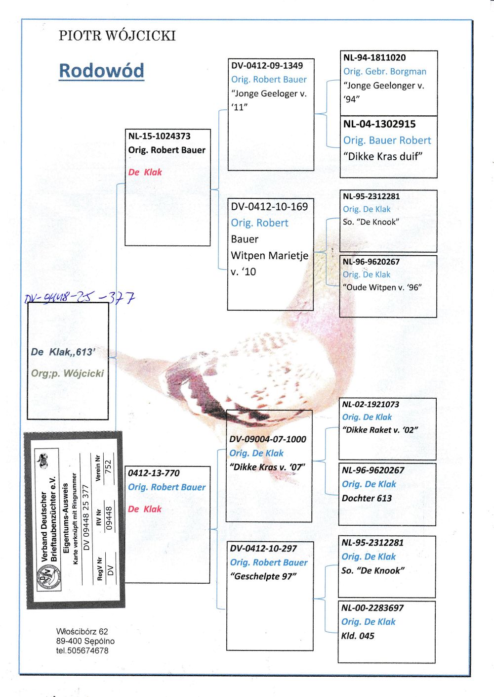 oryg. Wójcicki Piotr (100% Janssen - De Klak) Szczegóły pochodzenia w rodowodzie i załączonych materiałach. Więcej informacji o gołębiach i transporcie pod nr tel.: +48 505 674 678.