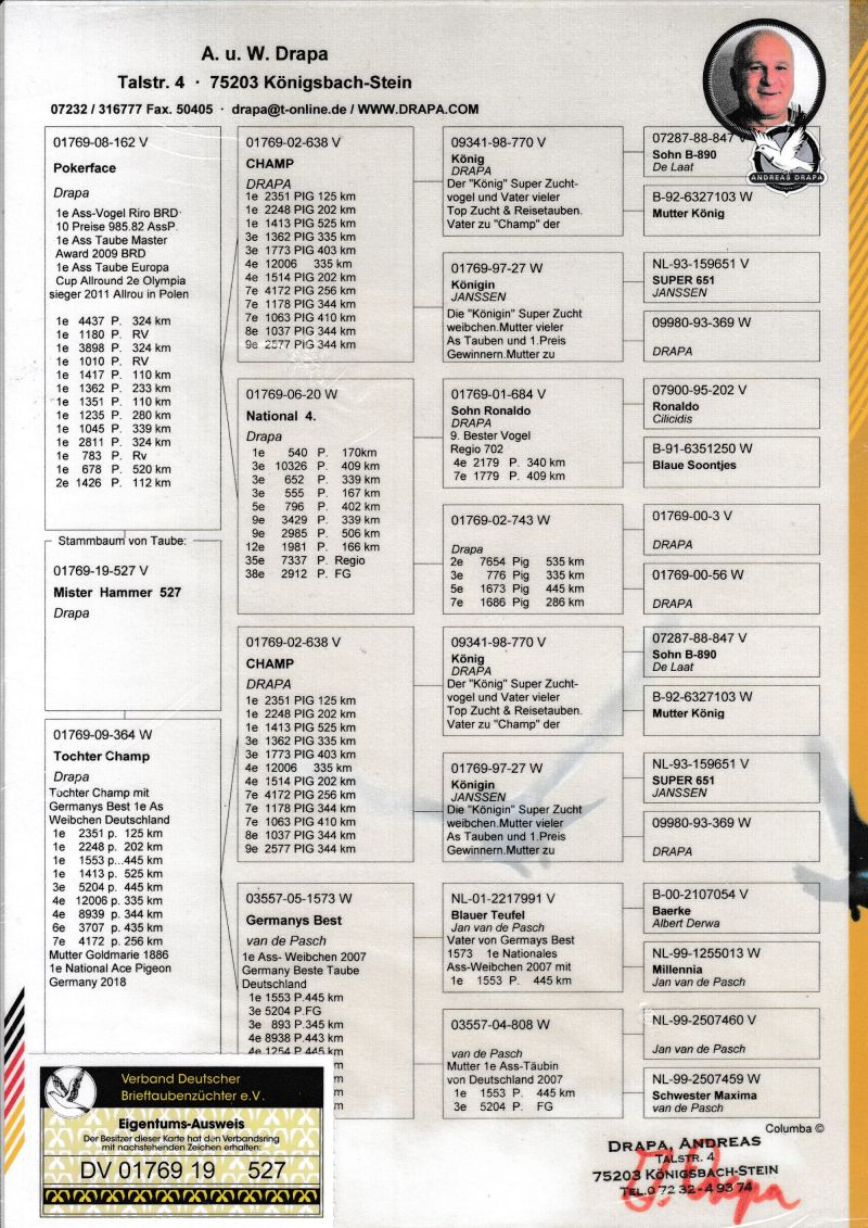 Profesjonalna hodowla z wieloletnim doświadczeniem, posiadająca w swoim stadzie materiał najwyższej światowej klasy. Więcej informacji w załączonych materiałach oraz pod nr tel. 792-175-024 Oferowany gołąb to prawdopodobnie SAMICA. Płeć pisana orientacyjnie Wysyłka 100 zł