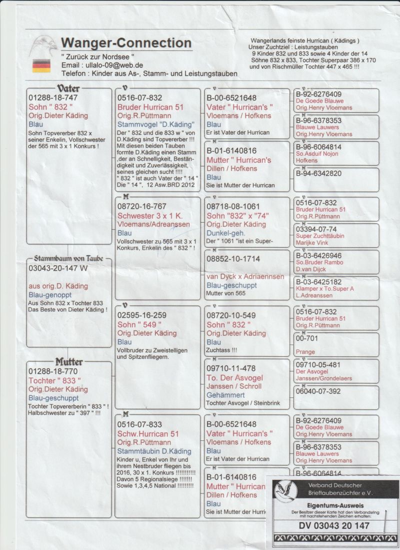 Samiczka super pochodzenia, jest wnuczką do "832""833"Asy (brat i siostra HURRICAN 51) rozpłodowe u Dieter Kading. Samica pięknej budowy!!! W 2025 r. w 100% płodna!