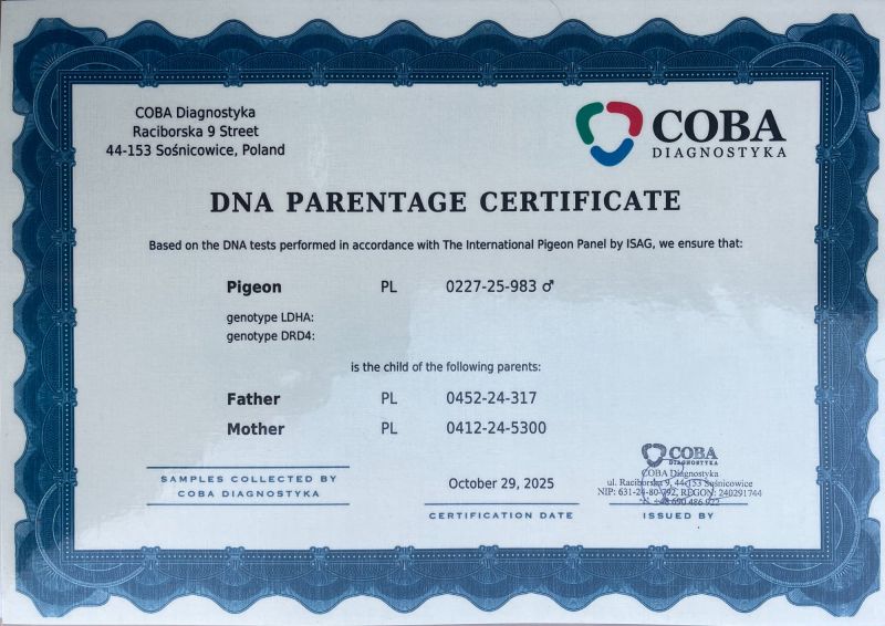 Płeć: młody gołąb Hodowca - rasa: oryg. Bernard Jakubowski Zakończenie: 27.12.2025 godz. 14:26
