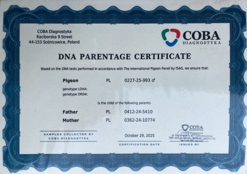 PL-0227-25-993 RICKY x BLACK SUN Tom van Gaver x Hardy Kruger - certyfikat DNA