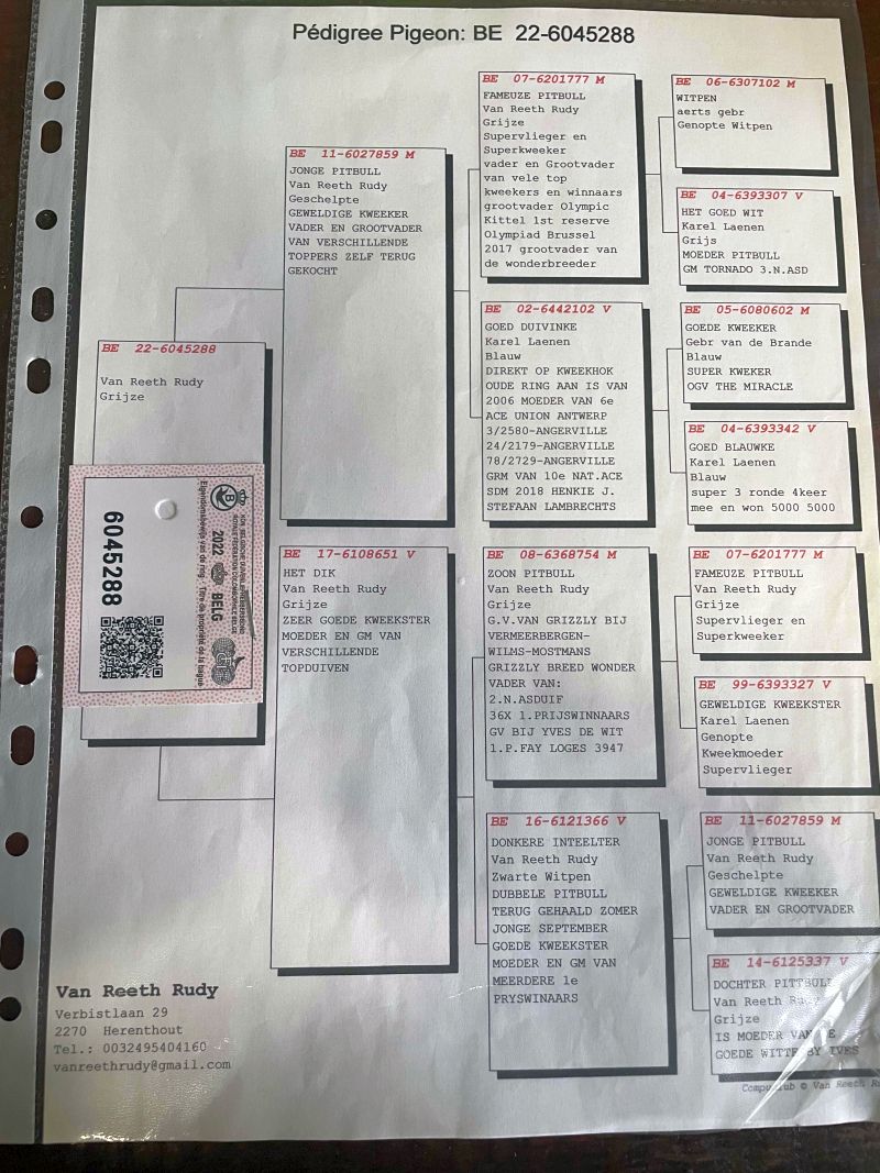 Oryginalny gołąb z hodowli Van Reeth Rudy Syn "JONGE PITBULL" - Najlepszy syn "FAMEUZE PITBULL" Szczegóły pochodzenia w rodowodzie. Gołębie po kuracjach, przygotowane do lęgów. Więcej informacji pod numerem telefonu 782 740 221 Wysyłka po uzgodnieniu z prywatnym kurierem, możliwy odbiór na wystawie, ewentualnie odbiór osobisty. GRATIS samica DV-01928-20-989 oryg. Erhard Pahnke (100% Steenbergen) - nie ma rodowodu